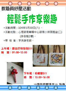 心理諮商輔導中心本學期最後一場教職員紓壓活動來囉!!此次主題為手作DIY,上午場為用蝶古巴特拼貼藝術來製作專屬自己圖案的包包,下午場開放親子報名同樂,一起來製作可愛的毛根筆喲!歡迎全校教職員報名參加,一同來享受手作樂趣,又能製作專屬自己的作品喲! ◎活動時間:104年05月30日(六)。 上午場 09:00-12:00:蝶古巴特包包DIY 下午場 13:00-16:00:毛根筆DIY(開放親子報名同樂) ◎活點地點:心理諮商輔導中心諮商小築團體室(二)。 ◎活動講師:李泱錚老師。 現職:幸福手創館店長。 彰化蘭馨會才藝指導老師。 南山人壽員大通訊處指定才藝講師。 ◎活動人數:本校教職員為主,上午場20人、下午場35人,下午場一人最多報名5個名額。 ◎報名方式:即日起至諮商中心網頁填寫報名表,額滿為止,報名成功者將寄發錄取通知,報名網址如下:http://www.pcc.ndhu.edu.tw/files/14-1011-85304,r555-1.php。 ◎聯絡人:林佳儀 (03)863-2263