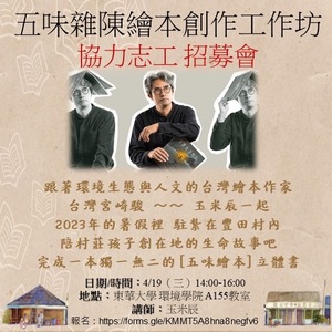 志工招募 & 說明會 玉米辰向豐田五味屋提出浪漫的想法: 『用暑假的時間來陪村莊孩子閱讀與創作吧!』 在花東縱谷裡的「豐田冊所」 讓鄉村孩子為自己創作一本「立體書」 五味屋的造型,多變的呈現方式 需要志工做為孩子們的後盾! 4/19下午玉米辰在東華大學 親自說明創作的邀請 邀請您來與玉米辰&孩子共同完成這個夢想 👉志工報名(含4/19 說明會) https://forms.gle/KMMT5A8hna8negfv6 👉計畫網頁 https://5wayhouse.mystrikingly.com/ 👉關於玉米辰 https://www.openbook.org.tw/article/p-65776/