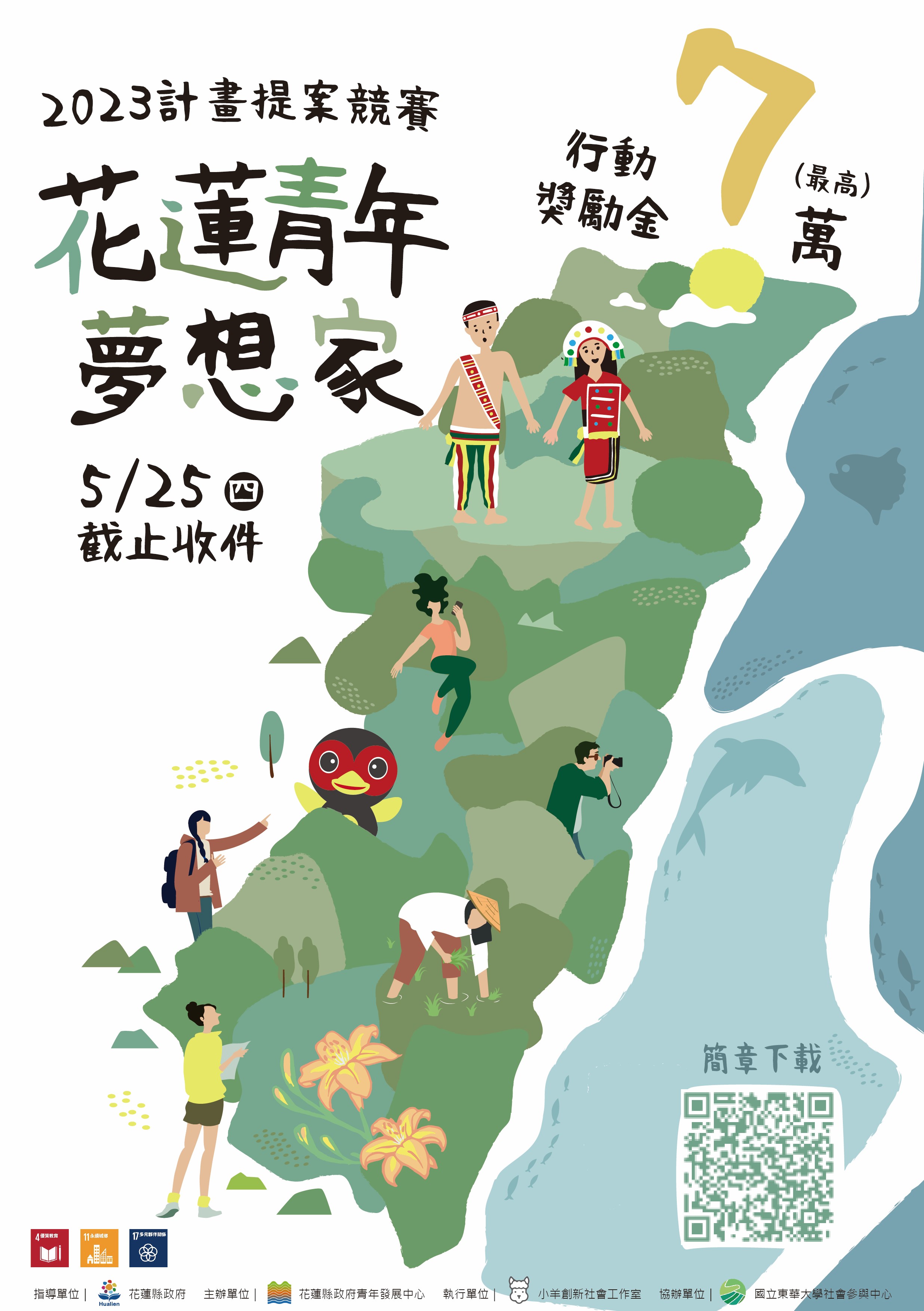 你們在花蓮求學的階段中是否開啟了對花蓮未來更多的想像?你們是否曾經想過要為自己的家鄉出一分力?是否希望能夠關心當代社會的議題,並為之發聲?共同打造花蓮的未來,你的想法很重要! 【花蓮青年夢想家提案競賽】是你們不可錯過的絕佳機會!💪 還在猶豫嗎?沒有嘗試過提案,覺得怕怕的嗎?還想更精進自己的能力嗎? 別慌別慌~我們提供了滿滿的輔導資源與相關技能工作坊~ 歡迎動動手指,啟動你的提案旅程✨ 那還在等什麼啦~還不快報名參加「2023花蓮青年夢想家說明會」詢問心中的疑慮,找到提案方向🧭 🎯2023花蓮青年夢想家提案說明會🎯相揪一起來提問! 🔎適合什麼樣的人🔎 • 好奇可以如何解決花蓮在地痛點、尋求資源的你 • 渴望能嘗試改善花蓮在地議題展開跨域合作的你 • 期許發揮自身所長、推動花蓮在地實質改變的你 • 想知道自己是否適合申請花蓮青年夢想計畫的你 👉說明會名連結:https://forms.gle/W5oTfCLdhDife5Pm9 不要猶豫,趕快關注起來,組隊報名參加!一起為花蓮的未來出一份心力💪 🟡報名資格:對社區觀察及公共議題具有熱誠,並就讀花蓮縣內高中職及大專院校或設籍 本縣在外地就學之具備在學學籍學生,須以 2-5 人團隊報名。 🔵提案競賽報名時間:即日起至5月25日止 🔵計畫簡章與申請書下載連結:http://ydc.org.tw/dl.aspx?kind=6 👉官方網站:http://ydc.org.tw 🔴洽詢窗口 小羊社會創新工作室-黃小姐,連絡電話:0919395630、趙小姐,聯絡電話:092156521 指導單位|花蓮縣政府 主辦單位|花蓮縣政府青年發展中心 執行單位|小羊創新社會工作室 協辦單位|國立東華大學社會參與中心 #花蓮青年夢想家 #學生也很有實踐力 #7萬行動金自己來賺