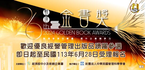 經濟部中小及新創企業署為帶動中小企業讀書風氣,快速掌握知識的方法,亦是學習新知的管道,讓更多優良中小企業經營管理出版品被看到,本(113)年度將舉辦「金書獎甄選活動」,歡迎各優良經營管理出版品踴躍報名參加! 1. 報名時間:自即日起至民國113年6月28日(星期五)下午5時止。(以郵戳為憑) 2. 資料索取及下載方式: (1) 執行單位:社團法人中華民國管理科學學會 (2) 地址:100232臺北市中正區羅斯福路一段4號13樓 (3) 網址:https://www.sme.gov.tw/books (金書獎網站) 3. 聯絡窗口:社團法人中華民國管理科學學會 張小姐 電話:(02)3343-1122 E-mail:books@mail.management.org.tw