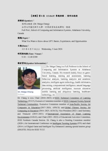 演講者(Speaker): 張明治教授 (Dr. Maiga Chang) 加拿大阿薩巴斯卡大學,計算與資訊系統學院,教授 Full Prof., School of Computing and Information Systems, Athabasca University, Canada 講題(Topic): What You Want to Know about GPT: Basics, Experiences, and Opportunities 日期(Data): 113年6月5日(三) Wednesday, 5 June 2024 時間與地點(Time / Venue): 9:10 – 11:40 D309 講者資訊(Speaker Information): Dr. Maiga Chang is a Full Professor in the School of Computing and Information Systems at Athabasca University, Canada. His research mainly focus on game-based learning, training and assessment; learning behaviour analysis; learning analytics and academic analytics; intelligent agent technology; health informatics; data mining; computational intelligence; natural language processing; artificial intelligence; museum education mobile learning and ubiquitous learning; healthcare technology, etc. Dr. Chang is now Chair (2018~2023) of IEEE Technical Committee of Learning Technology (TCLT), Executive Committee member of IEEE Computer Society Special Technical Communities, Executive Committee member of Asia-Pacific Society for Computers in Education (2017~2024, APSCE) and Global Chinese Society for Computing in Education (2016~2025, GCSCE), Vice President (2022~) and Secretary and Treasurer (2019~2021) of International Association of Smart Learning Environments (IASLE), and Chair (2021~2022) of Educational Activities Committee, IEEE Northern Canada Section. Dr. Chang is also a Steering Committee member (2020~) for International Conference on Intelligent Tutoring Systems (ITS) and chair (2014~) of Digital Game and Intelligent Toy Enhanced Learning special interest group (DIGITEL SIG) for IEEE TCLT.