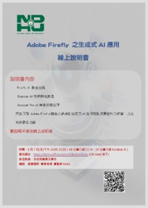 Adobe Firefly 是 Adobe公司發展的生成式AI, 本次說明會主題: - Firefly AI創意生成 - Express AI快速創意實現 - Acrobat Pro AI智能文檔助理 想要了解 Adobe Firefly 如何幫助您更便利的作業,以及其他更多功能, 歡迎報名參加線上說明會: 時間:6月7日(五)下午14:00-15:00(40分鐘介紹CC AI、20分鐘介紹Acrobat AI) 報名網址:https://forms.office.com/r/hBv5hm5Ddu (eDM如附檔) 參加對象:本校教職員及學生 講師:展碁國際 專案經理 曹聖庚Mark