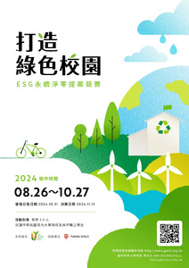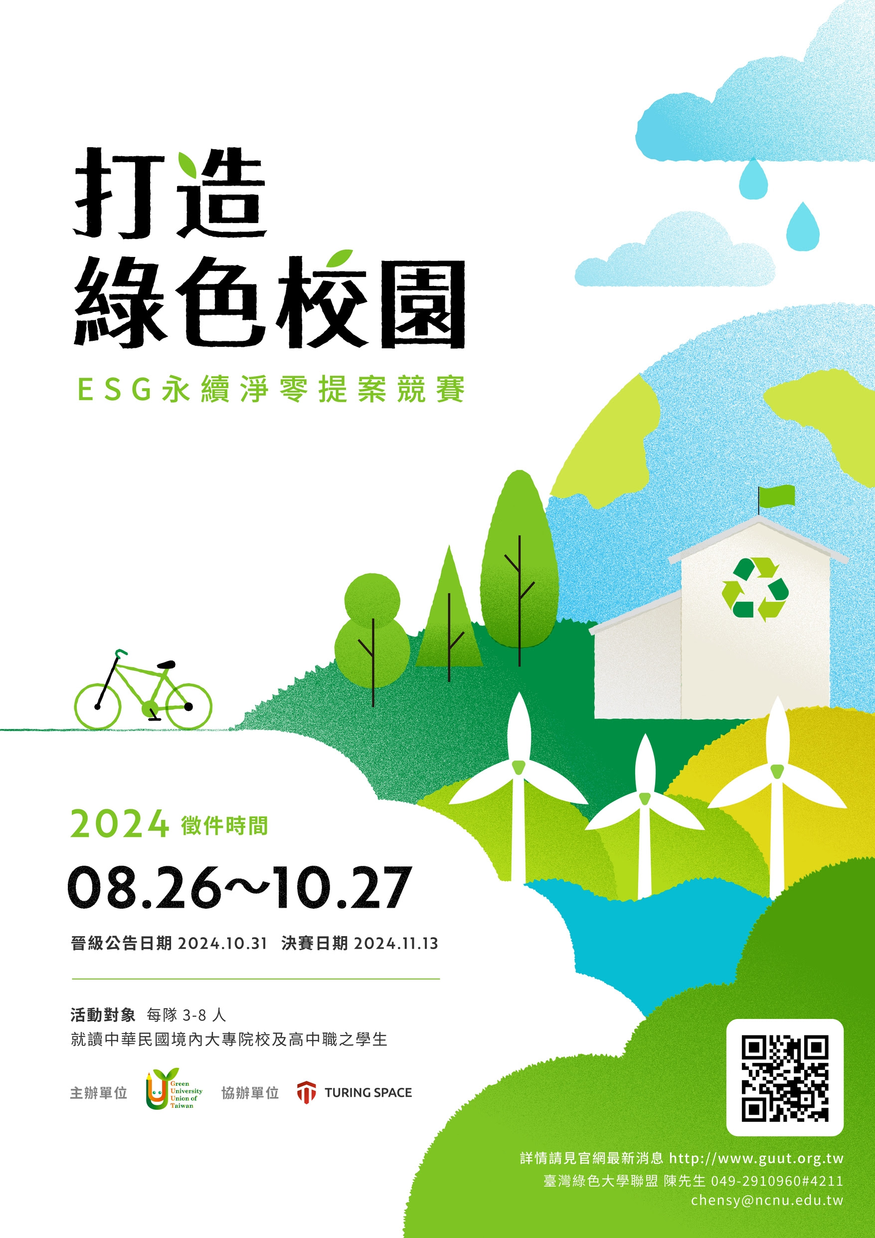 各位同學您好! 臺灣綠色大學聯盟 x Turing Space 美商圖靈誠摯邀請您協助推廣「打造綠色校園,ESG 永續淨零提案競賽」。此計畫是為中華民國境內之大專院校、高中職學生所舉辦的 ESG 永續淨零提案計畫,目的是讓對永續議題有想法、有創意、卻不知如何實踐的學生,勇敢化創意為行動,一起為校園推動淨零轉型,打造永續共好的學習環境! 誠摯邀請各位優秀同學踴躍報名,儘早報名! 活動資訊 競賽名稱:打造綠色校園!ESG 永續淨零提案競賽 活動對象:就讀中華民國境內大專院校及高中職之學生,每隊 3 - 8 人 活動時程 徵件時間:2024.08.26 - 2024.10.27 晉級公告日期:2024.10.31 決賽日期:2024.11.13(線上舉行) 報名連結:https://tur.pse.is/6d4ykq ※本場活動聯繫人: 臺灣綠色大學聯盟 陳先生 Email:chensy@ncnu.edu.tw 電話:049-2910960#4211