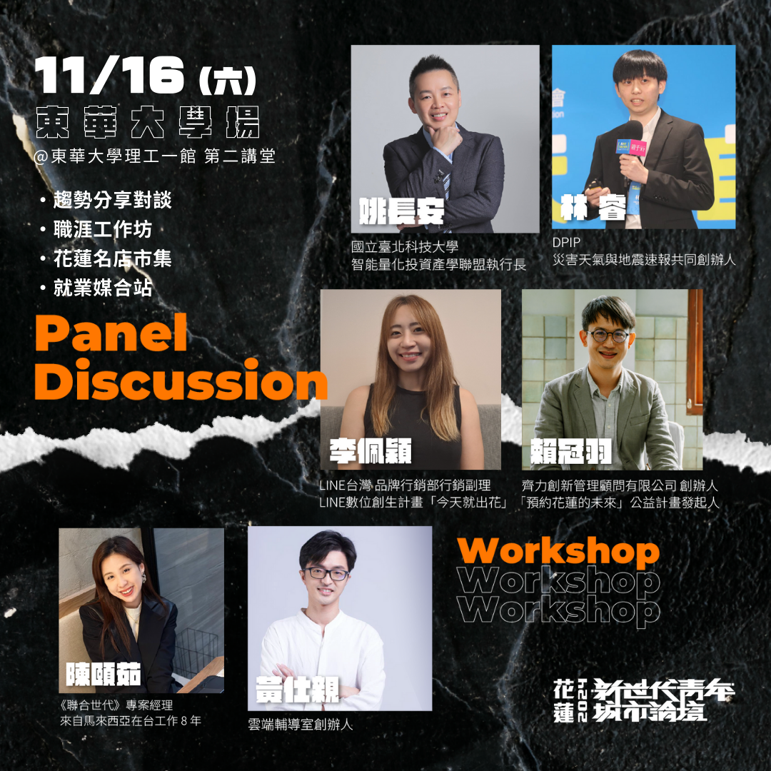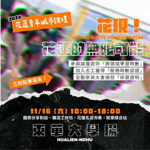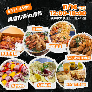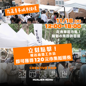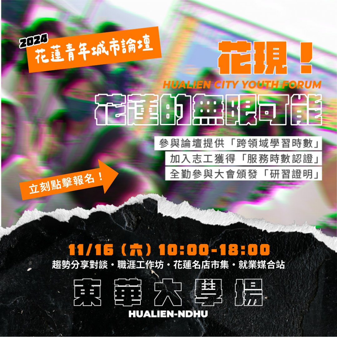 【#2024花蓮新世代青年城市論壇in東華大學】⚡️ 誠摯邀請您一起參加東華生專屬「新世代青年城市論壇」, 趨勢分享對談 x 職涯工作坊 x 花蓮名店市集 x 就業媒合站! ➤參與論壇提供「跨領域學習時數」 ➤加入志工獲得「服務時數認證」 ➤全勤參與大會頒發「研習證明」 ➤前80名報名且參加兩場工作坊,可兌換解憂市集120元市集園遊卷!(限量) 報名表:https://forms.gle/KA9k1zTm3845ojqu7 【開箱!解憂市集解鎖花蓮名店】 有利脆皮豬、宜蘭香炸螃蟹、秘醬滷味 方方家料理廚房、鮮烤再說、陷食餐車、肚肚扁巴西餡餅 凍心鷗翼餐車、壹拾壹綠豆沙鮮奶、貓棒棒鬆餅屋 煥味私烤、原香嘟論竹筒飯、Romancer壽豐浪漫暴走 ===========【精彩內容】============= 【🛰2場趨勢對談 Panel Discussion 🗣️】 五新議題講堂!解鎖體驗成為「花蓮未來行動家」! 💡 【📢黃金講員| 連結業界的最佳機會!Keynote Conversation🌟】 新創業|《國立臺北科技大學智能量化投資產學聯盟執行長》姚長安 新科技|《DPIP災害天氣與地震速報共同創辦人》林睿 新創業|《齊力創新管理顧問有限公司創辦人》 賴冠羽 新媒體|《LINE台灣品牌行銷部行銷副理》李佩穎 【🛒新創業解憂市集X校園就業媒合站 Creative Fair 】 我在花蓮我驕傲:花蓮在地特色店家 校園就業媒合站:串連未來就業資源 【⭐️五新WorkshopI未來工作坊 Future Workshop 】 新創業X新教育|兩張表格找到人生最佳出路 新媒體X新創業|善用AI工具打造個人の品牌 新教育X新創業|僑外生在台灣工作的秘訣 ➤「前80名報名」且參加「兩場工作坊」(三場選兩場參加),可兌換解憂市集120元市集園遊卷!(限量) 【🎙️東大舞台!表演嘉賓開箱 The Stage🌟】 《大嘻哈時代2》 Forty顏世琳、東華吉他社、東華電音社 ===========【論壇資訊】============= 🔶 論壇時間:11/16(六) 10:00~18:00(9:30入場) 🔶 活動地點:東華大學理工一館及外側人行道 🔶 活動費用:活動免費! 🔶 參與對象:東華大學學生、在校教職人員、在職進修班 🔶 活動窗口:何小姐0910363023、婁小姐0932505081 🔶 主辦單位:社團法人青年共創發展協會 🔶 協辦單位:國立東華大學管理學院、國立東華大學洄瀾共好大學社會責任中心、國立東華大學國際事務處、東華大學倆叄人社 ==========【志工訓練】=============== 🔶 行前訓練時間:至少擇一參加,依簽到退時間計算服務時數 11/13(三)志工訓練二:活動預備 18:30-20:30 🔶 活動場佈時間:可自由參加,依簽到退時間計算服務時數 11/15(五) 場次一:10:00-12:00 場地清潔 場次二:16:00-19:00 器材佈置