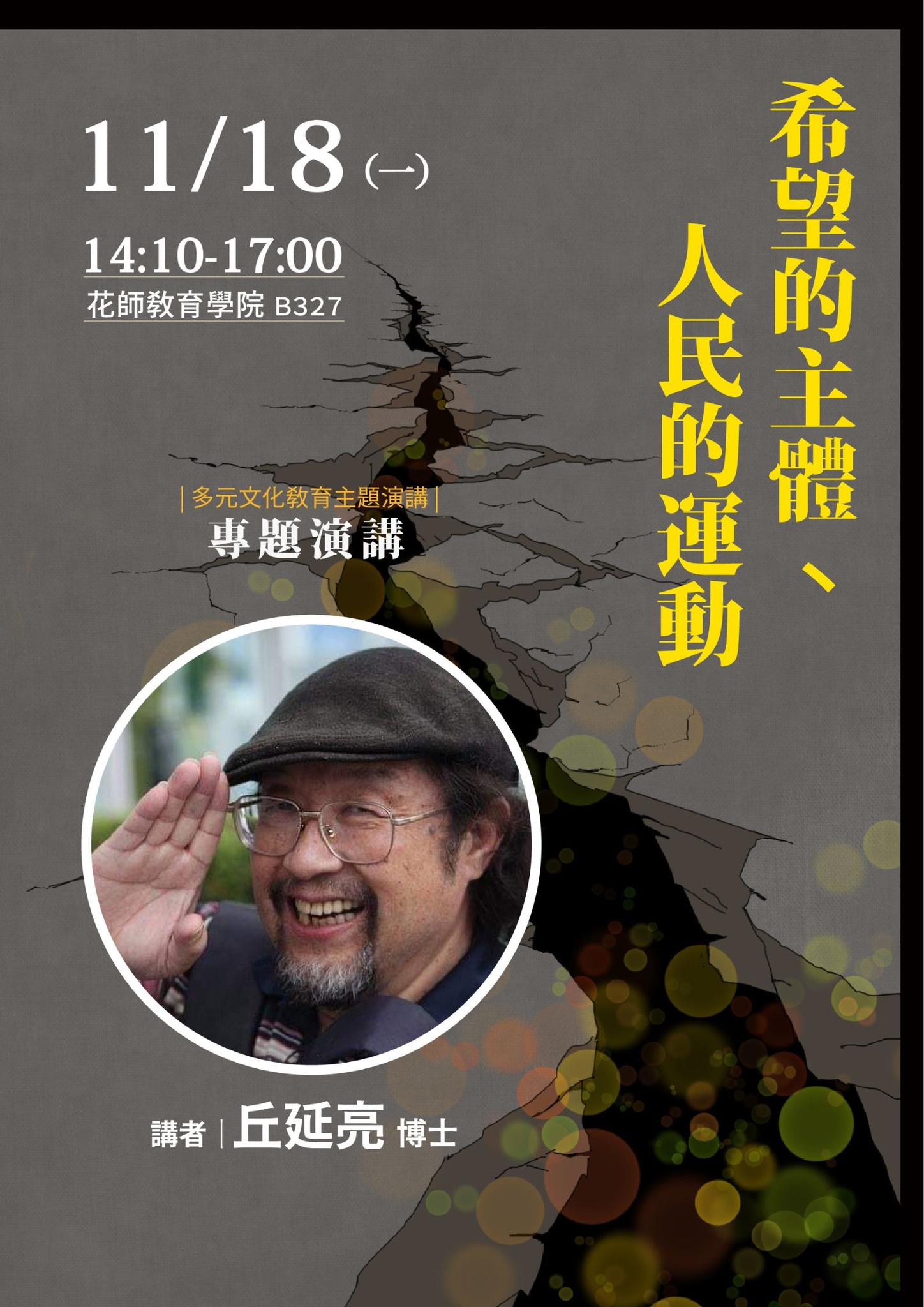 |主題| 希望主體、人民的運動 ▸ 講者|丘延亮博士 ▸ 日期|2024/11/18(一) ▸ 時間|14:10-17:00 ▸ 地點|東華大學花師教育學院 B327 _______________________________________ ▹主辦單位|東華大學花師教育學院多元文化教育碩博班 ▹協辦單位|東華大學多元文化教育中心