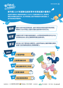 分類: 其他公告 來源: 學務處畢業生及校友服務組 - 黃文雯 - wenwen@gms.ndhu.edu.tw - 電話6283 對象: 全校教職員_全校學生 標題: 【轉知】新竹縣政府教育局「新竹縣114年度數位創新青年培育就業計畫」 日期: 2025-01-15  ( 星期三 )  11:17 附檔: 計畫宣傳單_114年竹縣青年培育_A5雙面_正面_0.jpg (2 MB)   計畫宣傳單_114年竹縣青年培育_A5雙面_反面_0.jpg (2 MB)