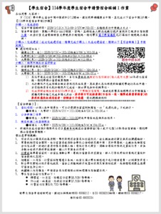 各位同學 大家好: 下(114)學年學生宿舍申請作業將於3/12開始,歡迎同學踴躍提出申請,並完成以下宿舍申請3步驟。 【重要說明】 1. 由於宿舍床位申請攸關同學權益,請同學務必留意各項作業申請時間,並詳閱每一階段床位申請時程與說明,倘有逾期者,基於公平原則,無法申請補辦。 2. 依本校規定宿舍床位優先分配之對象(包含低收入戶、中低收入戶、身心障礙生、具113學年住宿資格之境外生及大一升大二的同學)亦須依規定時間完成床位申請作業,若未申請,視同不申請住宿。 3. 五年連續修讀學、碩士學位(3+2)同學於114年5月另行公告辦理專案申請,本次無須提出申請。 4. 114學年度宿舍住宿時間: (1) 114-1:114年9月3日至115年1月12日 (2) 114-2:115年2月20日至115年6月29日 【114學年度宿舍申請3步驟】 步驟一:完成登錄 1. 宿舍申請登錄時間:2025/3/12(三)12:00~3/27(四)12:00,各階段床位申請截止日止。 2. 宿舍申請登錄,需輸入學校e-mail帳號、密碼,並確認本人郵局或銀行帳戶資料,且已繳清住宿相關欠費。 3. 欲登記室友者需驗證室友學號與手機號碼,請同學至電子學習履歷先行確認手機號碼正確無誤。 步驟二:完成選宿(成功完成選宿者,請續完成步驟三;未成功選宿者,請詳閱以下【宿舍候補Ⅰ】申請說明) ☆ 選宿時間如后: ●碩博生(男、女):2025/3/17(一)12:30起至3/19(三)12:00止。 ●大學部(女):2025/3/20(四)12:30起至3/22(六)12:00止。 ●大學部(男):2025/3/25(二)12:30起至3/27(四)12:00止。 步驟三:期限內繳交住宿保證金 1. 住宿保證金繳交時間: ●碩博生(男、女):2025/3/24(一)12:00起至3/31(一)24:00止。 ●大學部(男、女):2025/3/31(一)12:00起至4/9(三)24:00止。 (1) 床位申請成功者須於期限內,自行至臺銀系統繳交住宿保證金(每人貳仟元整)以取得住宿資格,請同學務必留意繳費期限。 (2) 未於期限內完成保證金繳交者視同床位放棄,其放棄之床位將提供候補同學進行床位申請,若因特殊因素未能於期限內完成者,務必事先告知承辦單位。 (3) 完成保證金繳交者具有114學年度上、下學期住宿資格,為避免影響其他同學床位申請權益,建議同學珍惜已完成申請之床位,若非因不可抗拒原因(不含休、退、轉學或畢業等因素)仍要求放棄床位或退宿者,保證金不予退還,特此提醒與說明。 【宿舍候補Ⅰ】: 1. 【宿舍候補Ⅰ】:登記時間:以個人為申請單位,可自行選擇住宿莊別和寢室,以「先選先得」方式進行。 ●碩博生、大學部:2025/4/21(一)12:30起至4/23(三)12:00止。 2. 公告候補Ⅰ結果 ●碩博生、大學部:2025/4/28(一)12:00開放申請系統查詢床位結果。 3. 繳交候補Ⅰ住宿保證金 ●碩博生、大學部:2025/4/28(一)12:00起至5/4(日)24:00止。 候補床位成功者須於期限內自行至臺銀系統繳交住宿保證金(每人貳仟元整)以取得住宿資格,請同學務必留意繳費期限。 ※注意事項提醒: 1. 學生宿舍【涵星一莊】宿舍修繕作業,預計於114學年度第一學期施工完竣。本校將先提供【涵星二莊】供114學年度住宿申請,凡成功申請【涵星二莊】之住宿生,於114學年度第一學期,俟【涵星一莊】完工驗收後,配合學校規劃之時程,進行寢室搬遷至【涵星一莊】 (修建工程預計114-1期初完工),詳細相關作業時程將另行公告,敬請同學務必遵守與配合。 2. 宿舍床位以填滿床位為原則,學校得視宿舍需求和住宿狀況,由生輔組進行寢室與床位調遷編排。 3. 寒暑假期間宿舍關閉,有住宿需求者須配合學校公告時程另提申請;另於寒暑假,生輔組為維護宿舍住宿品質,將進行清潔作業及修繕工程;寄放行李之寢室,須配合寄放作業規定置放行李,若無法配合者將不提供寄放服務,個人行李請自行保管。 4. 行雲莊為寒暑宿莊別,住宿生須配合寒、暑假住宿需求淨空寢室,個人行李依寄放作業規定置放於宿舍提供之空間。 5. 迎曦莊、沁月莊與行雲莊採智慧電力系統,住宿生須以學生證悠遊卡先行儲值電費,以利寢室用電。 6. 配合學校實施垃圾不落地政策,宿舍公共區域將不放置垃圾筒及資源回收筒,為維護環境衛生應遵守宿舍生活公約。 7. 攸關個人住宿權益,申請宿舍床位前請務必詳細閱讀住宿相關法規。 8. 學生宿舍各莊住宿費如下: 擷雲莊、沁月莊、迎曦莊住宿費$9,500/每學期。 仰山莊、涵星莊、向晴莊住宿費$7,500/每學期。 行雲莊住宿費$10,700/每學期。 對學生宿舍申請有疑問者,歡迎洽詢陳助理03-8906212,李助理03-8906213,鍾助理03-8906217,陳校安03-8906224 學務處生活輔導組關心您~