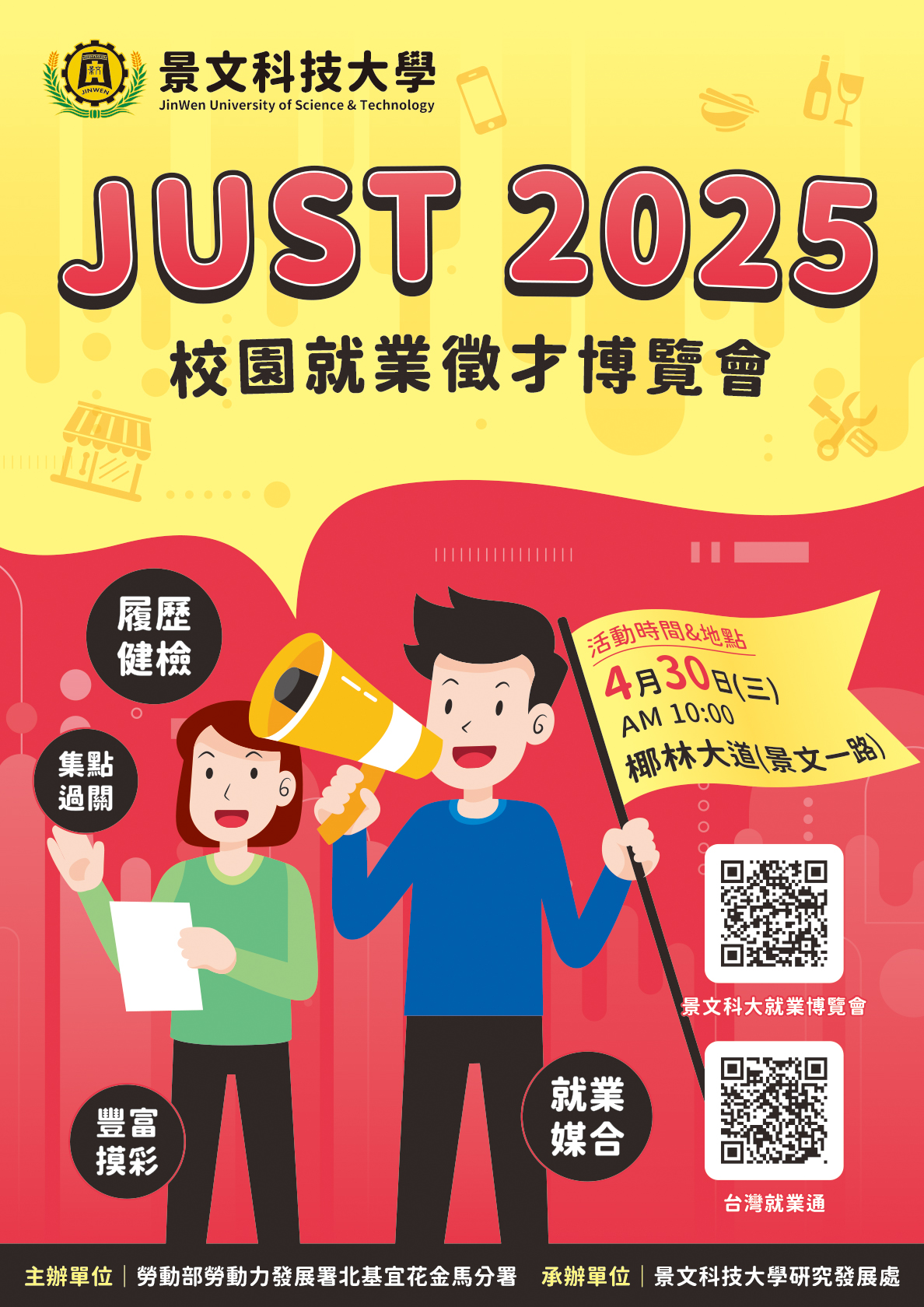 一、活動日期:114年4月30日(星期三)上午10時起至下午3時止。 二、活動地點:景文科技大學椰林大道(景文一路)。 三、活動資訊:https://rd.just.edu.tw/files/11-1004-5309.php?Lang=zh-tw。 四、若有任何活動相關疑問,歡迎洽詢景文科技大學研發處就業輔導組梁進平組長,電話:02-82122000分機2392、2393。 🔥更多徵才、就業、考試、實習、職涯講座訊息,請上學務處畢業生及校友服務組網站🔥 https://rb005.ndhu.edu.tw/p/412-1005-493.php