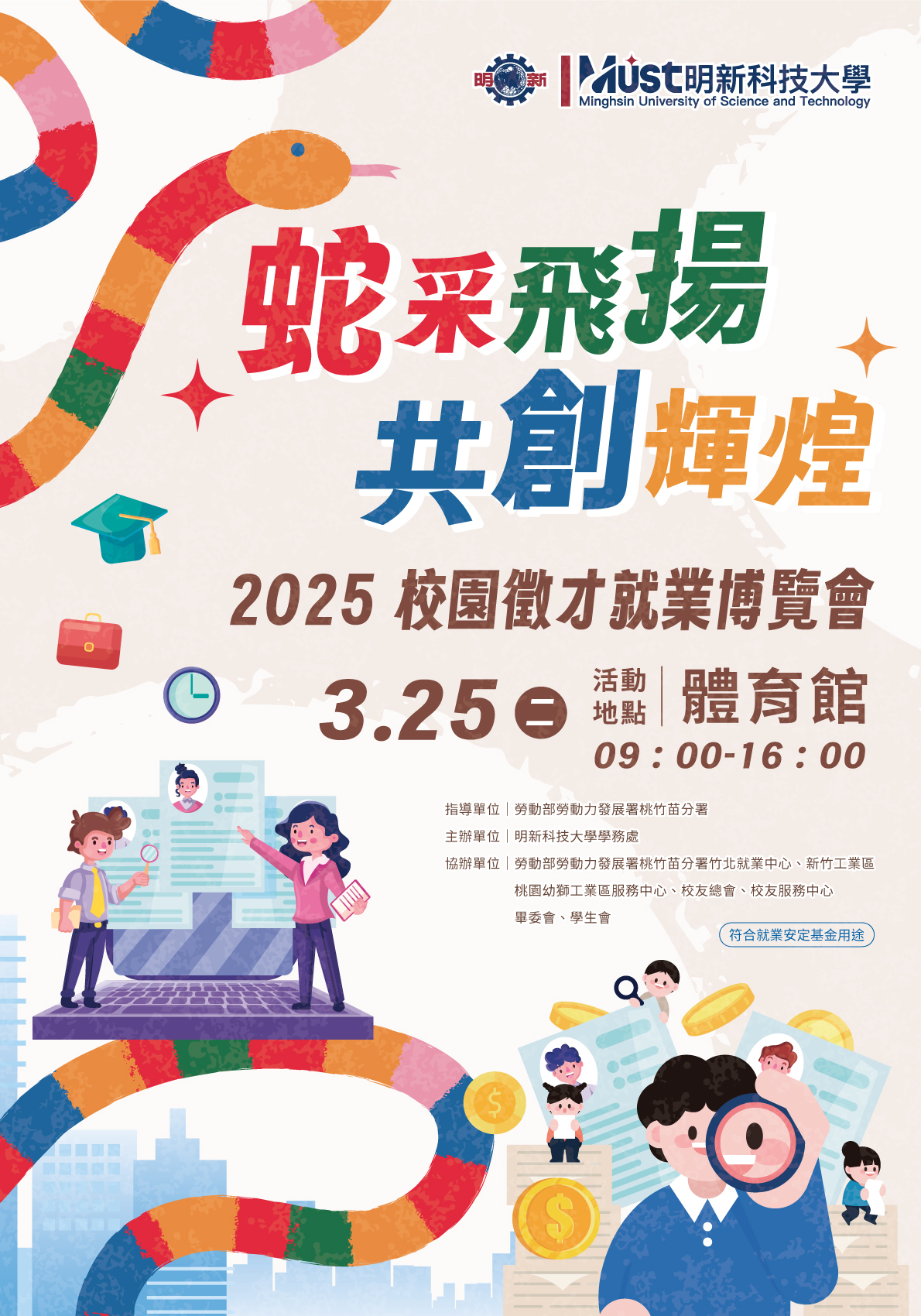 分類: 其他公告 來源: 學務處畢業生及校友服務組 - 黃文雯 - wenwen@gms.ndhu.edu.tw - 電話6283 對象: 全校教職員_全校學生 標題: 【徵才】明新科技大學114年3月25日辦理2025校園徵才博覽會 日期: 2025-03-24  ( 星期一 )  10:36 附檔: 明新科技大學2025校園徵才博覽會.jpg (1 MB)