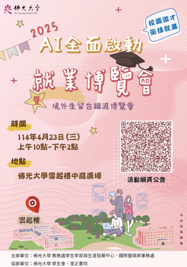 一、活動時間:114年4月23日(星期三)上午10時至下午2時。 二、活動地點:佛光大學雲起樓中庭(宜蘭縣礁溪鄉林美村林尾路160號)。 三、若有任何活動相關疑問,歡迎洽詢佛光大學教務處學生學習與生涯發展中心曾瑀心小姐,電話:03-9871000分機11162。 🔥更多徵才、就業、考試、實習、職涯講座訊息,請上學務處畢業生及校友服務組網站🔥 https://rb005.ndhu.edu.tw/p/412-1005-493.php