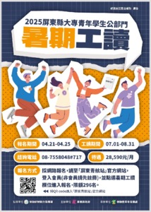 屏東縣政府辦理114年度大專青年學生公部門暑期工讀計畫海報及簡章如附件。