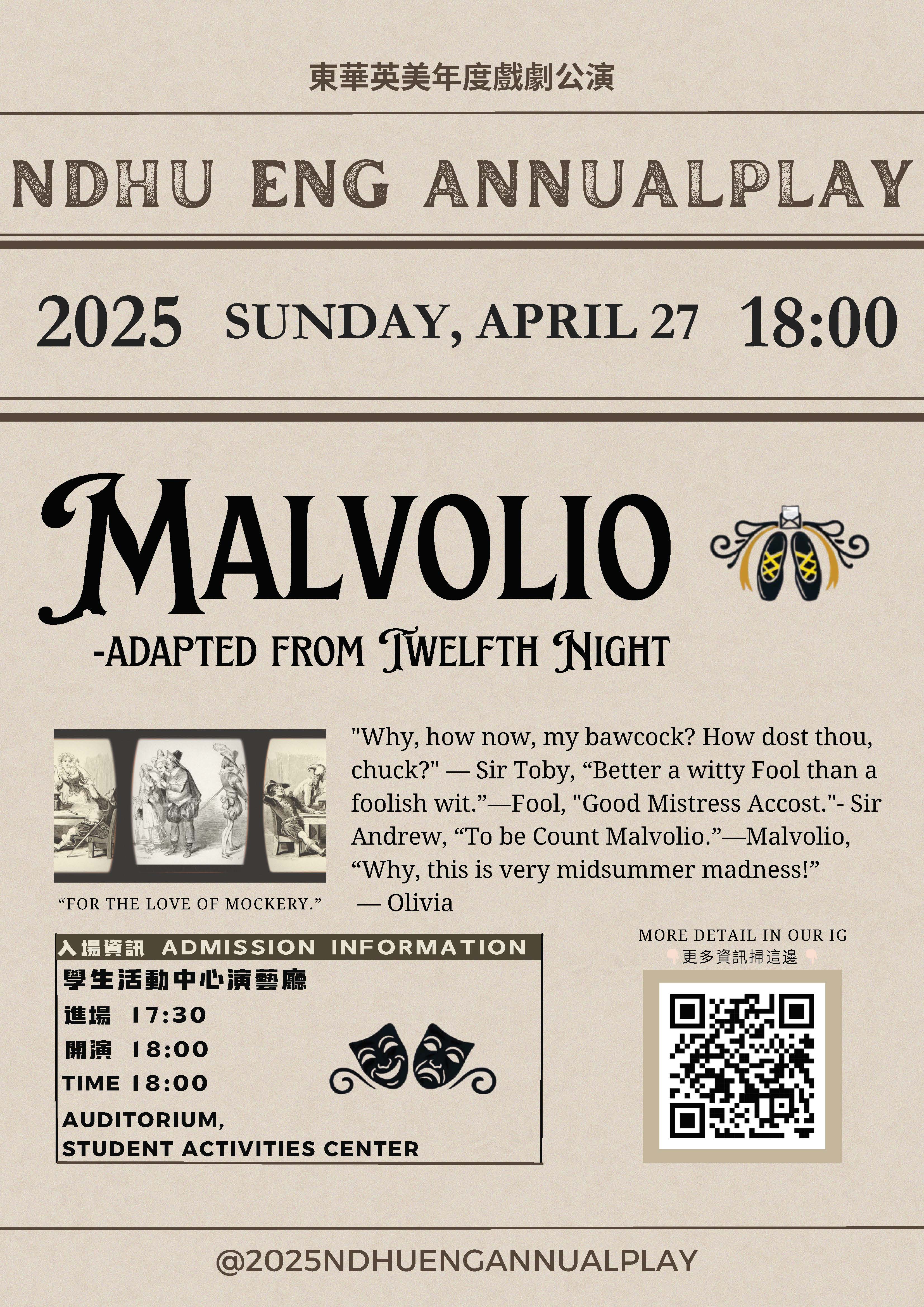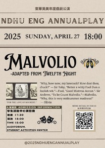 分類: 活動公告 來源: 英美語文學系 - 林旭霞 - shs0205@gms.ndhu.edu.tw - 電話5294 對象: 全校教職員_全校學生_休學學生_兼任教師_退休教職員_教職員眷屬 標題: 【英美系】戲劇公演-MALVOLIO 4/27(日) 18:00@學生活動中心演藝廳 日期: 2025-04-25  ( 星期五 )  16:54 附檔: 2025英美戲劇公演海報.jpg (1 MB)