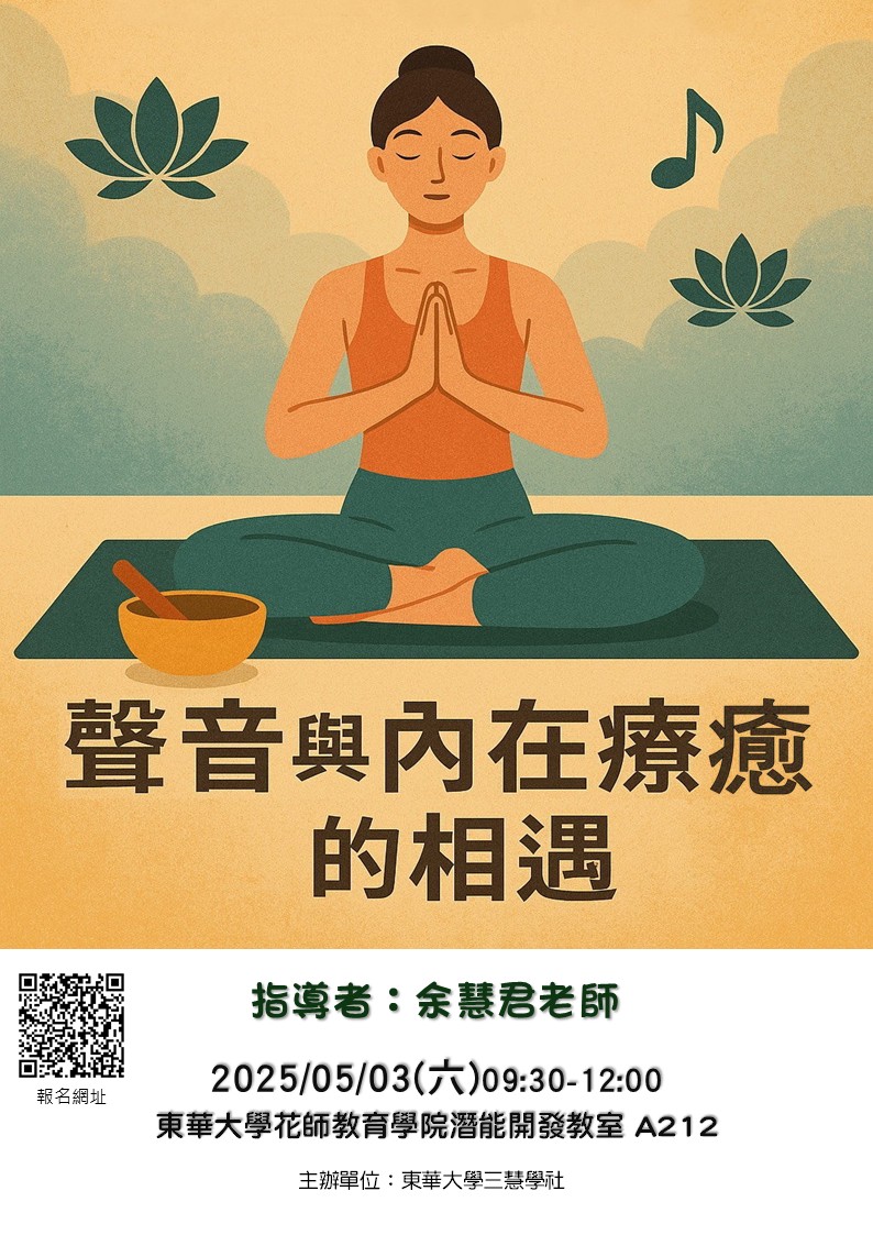 各位教職員生大家好: 東華大學三慧學社將於2025年5月3日(六)早上9:30至12:00於花師教育學院潛能開發教室A212舉辦禪修活動,余慧君老師將教導瑜珈與呼吸覺察。 👇報名表單https://forms.gle/ycgmopghbGdDkM177 祝平安順利 瑜珈~聲音與內在療癒的相遇 體驗聲音掃描與呼吸覺察 培養靜心狀態與內在傾聽力 🔅時間:5月3日(六) 上午9:30-12:00🏛地點:東華大學 花師教育學院 A212教室(潛能開發教室) ✴️指導者:余慧君老師 ❇️主辦單位:東華大學三慧學社