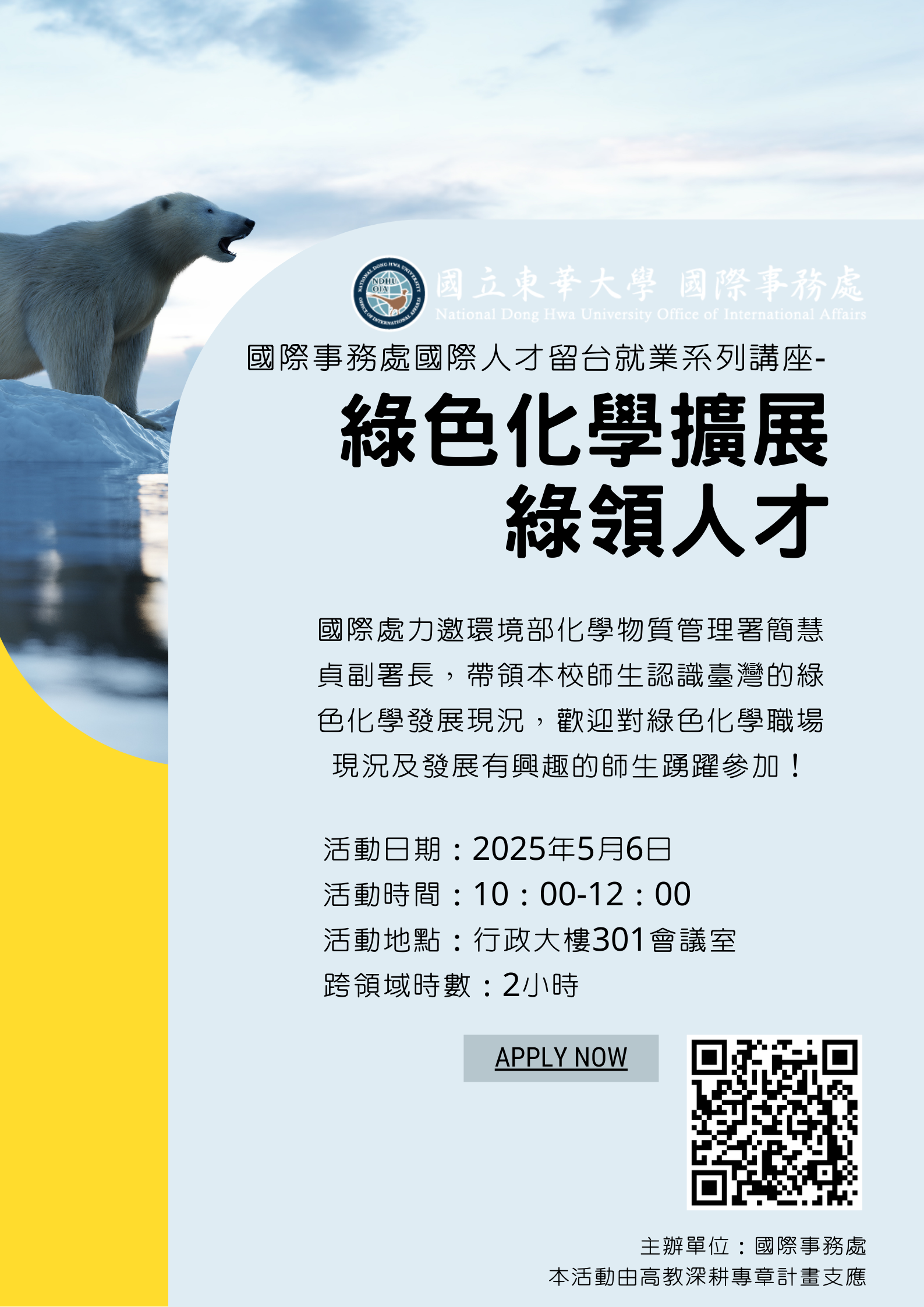國際處執行高教深耕專章計畫,辦理國際人才留台就業系列講座。透過本次力邀環境部化學化學物質管理署簡慧貞副署長,帶領本校師生認識臺灣的綠色化學發展現況,歡迎對綠色化學職場現況及發展有興趣的師生踴躍參加! 活動日期:2025年5月6日(二) 活動時間: 10:00 ~ 12:00 活動地點:行政大樓 301 名額:50人 (將依照跨域自主學習認證系統報名為主,請確認已成功報名) 活動提供跨領域時數(多元進取),請記得於跨域系統報名! 跨域報名網址: https://sys.ndhu.edu.tw/SA/XSL_ApplyRWD/ActAnnounce.aspx?ActID=25484
