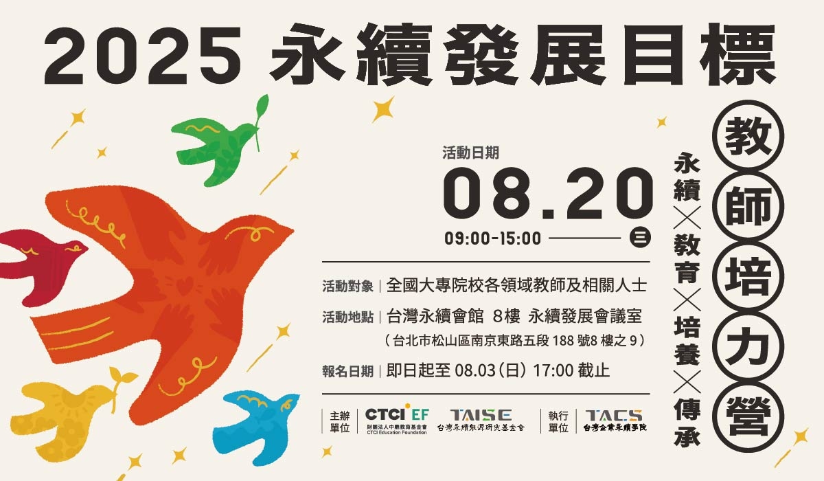 老師 您好, 協助轉台灣永續能源研究基金會辦理之「2025永續發展目標教師培力營」訊息摘要如下,有意參加者,敬請自行報名喔,謝謝。 為推動聯合國永續發展目標 (Sustainable Development Goals, SDGs)、並積極推動永續發展教育,本會已編撰「永續發展目標」教育專書(共4冊),期望提升產學研各界對永續發展之重視,邀集各領域之教授一同心得交流,並推廣台灣永續能源研究基金會永續發展目標教育專書。 活動日期: 2025 年 8 月 20 日 (週三) 活動時間: 09:00~15:00 活動地點: 台灣永續會館(臺北市松山區南京東路5段188號8號之9,近捷運松山新店線 - 南京三民站2號出口) 營隊活動與報名網址: https://taise.org.tw/events-view.php?ID=480 李莉莉 Li-Li Lee 國立東華大學 永續發展中心 治理策略組 Governance and Strategy Division, Center for Sustainable Development, National Dong Hwa University 電話 Tel:+886-3-890-5920 電子郵件 E-mail:sd@gms.ndhu.edu.tw 網址 Website:https://sdgs.ndhu.edu.tw/