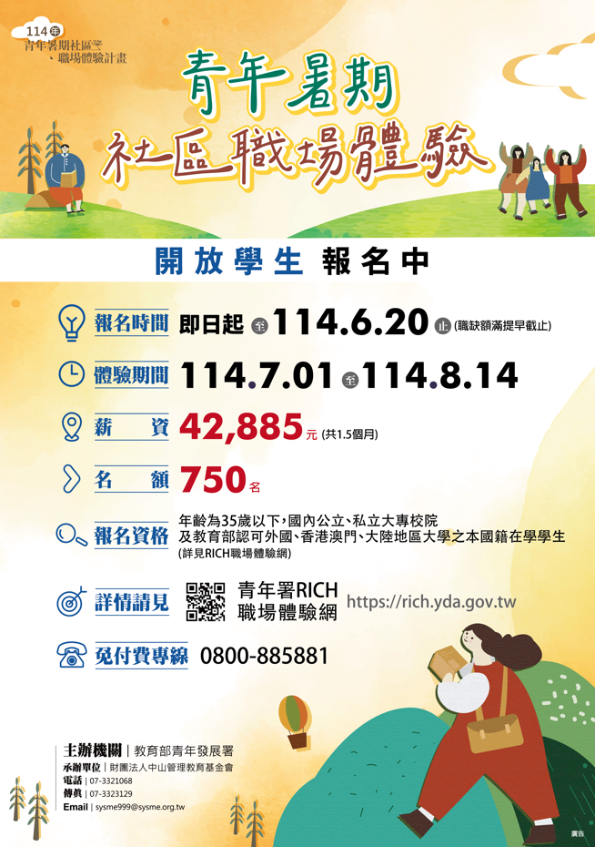 一、為增進青年了解職場,及早規劃職涯,財團法人中山管理教育基金會辦理教育部青年發展署旨揭計畫,於暑假期間至全臺社區產業、社會公益相關之非營利組織進行職場體驗,提供大專以上在學青年具學習性之750個體驗機會,協助提升就業力與職涯規劃能力,並學習社會責任意涵;另一方面以所學專業知能、創意活力,促進地方活化及社區永續發展。 二、檢附本計畫開放學生報名DM如附件,並可至教育部青年署「RICH職場體驗網」(rich.yda.gov.tw)-暑期社區職場體驗-職缺列表查詢相關職缺及投遞履歷。體驗期間為7月1日至8月14日止,由教育部青年署提供每人每月薪資28,590元;1.5個月合計42,885元。 三、本計畫承辦單位:財團法人中山管理教育基金會,承辦專員:黃小姐、邵小姐、李小姐聯絡電話:07-332-1068 #54、57、61,免付費專線:0800-885-881,傳真:07-3323129,電子信箱:sysme999@sysme.org.tw。 🔥更多徵才、就業、考試、實習、職涯講座訊息,請上學務處畢業生及校友服務組網站🔥 https://rb005.ndhu.edu.tw/p/412-1005-493.php