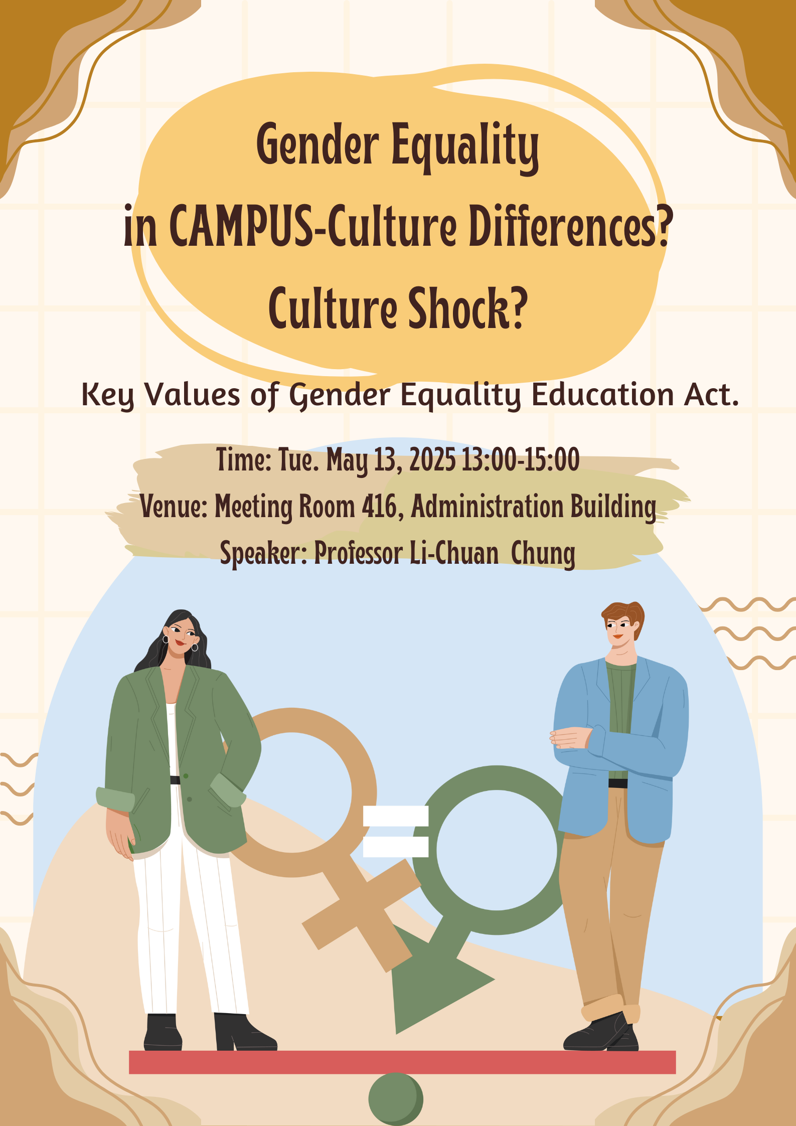 【OIA】GENDER EQUALITY in CAMPUS Culture Differences? Culture Shock? This talk will explore how gender equality is understood and experienced across different cultures on campus. We’ll discuss how cultural backgrounds can shape our views on gender roles, and how these differences might lead to misunderstandings or even culture shock. Join us for an open and engaging discussion! https://sys.ndhu.edu.tw/SA/XSL_ApplyRWD/ActAnnounce.aspx?ActID=25639 🗓 Date: Tuesday, May 13 🕐Time: 13:00–15:00 📍Venue: Meeting Room 416, Administration Building 🎤Speaker: Professor Li-Chuan Chung Language: English ‼️Participants will receive 2 hours of interdisciplinary learning credits ( Diverse Progress ).‼️ 【國際處】性平講座(全英文) GENDER EQUALITY in CAMPUS Culture Differences? Culture Shock? 日期:5/13(二) 時間:13:00-15:00 地點:行政大樓416會議室 講者:鍾莉娟老師 ‼️提供跨域時數2小時(多元進取)‼️ 報名連結: https://sys.ndhu.edu.tw/SA/XSL_ApplyRWD/ActAnnounce.aspx?ActID=25639