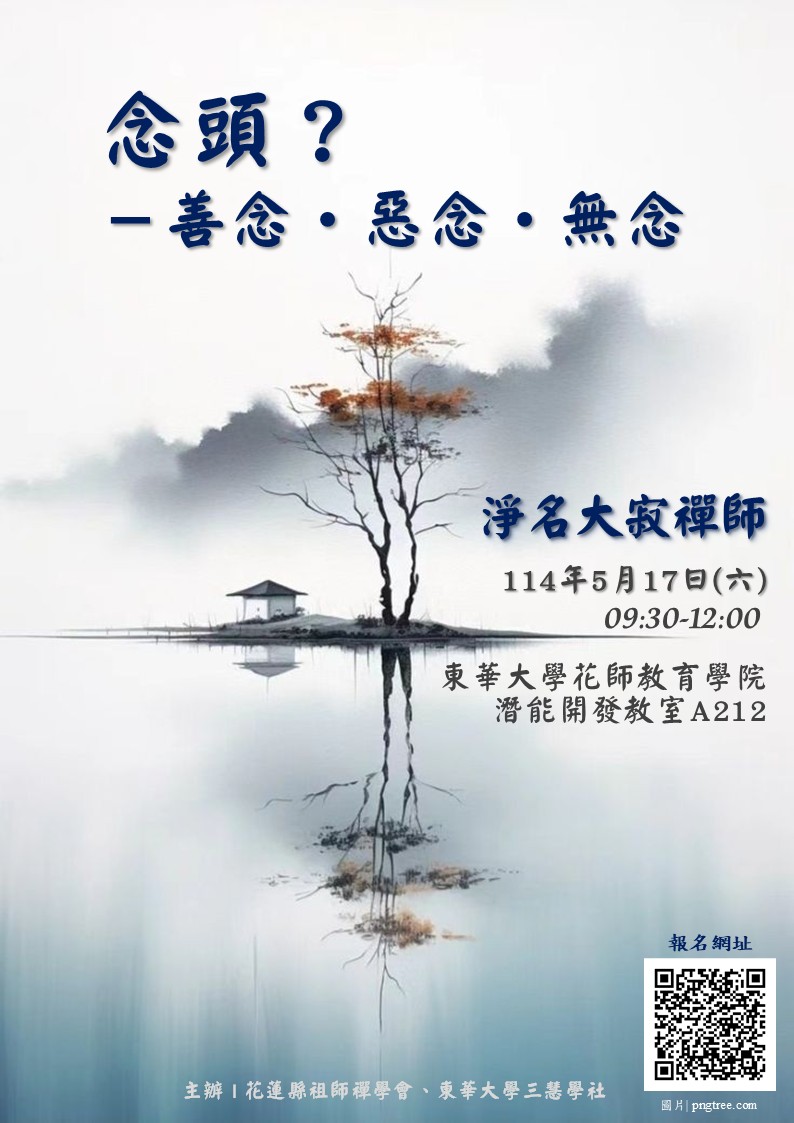各位教職員生大家好: 東華大學三慧學社將於2025年5月17日(日)早上9:30至12:00於花師教育學院潛能開發教室A212舉辦禪修活動。 👇報名表單https://forms.gle/HGVtUkkCrTFbB9Yq8 祝平安順利 念頭?---善念、惡念、無念 🕤 時間:5月17日(六) 上午9:30-12:00 🏛地點:東華大學 花師教育學院 A212教室(潛能開發教室) ✴️指導者: 淨名大寂禪師(韓國臨濟下第42世祖師) ❇️主辦單位:花蓮縣祖師禪學會 東華大學三慧學社