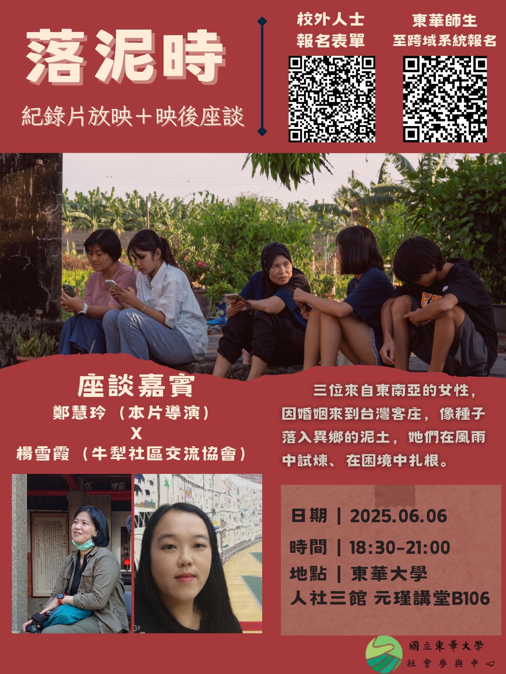 📽紀錄片簡介 三位來自東南亞的女性,因為婚姻遠渡重洋來到台灣客庄。一顆種子要在陌生的土地發芽成長,是會遭遇無數場風雨的試煉。 三位女性在台灣有挫折的時候,也有幸運的時刻,還好有堅韌的個性支撐,讓她們在此立地生根。新住民不是需要被特別對待的弱勢族群,他們需要的只是平等的對待,就會成為與我們同舟共濟的家人。 ------------------------------------ 🎤 映後座談嘉賓|與談人介紹 🟫 鄭慧玲|本片導演 畢業於國立台南藝術大學音像紀錄研究所,為獨立影像工作者,作品聚焦於環境、人物、歷史與性別平權。 她曾任台北電影節、南方影展、電視金鐘獎等評審,並多次擔任紀錄片課程講師。 代表作包括:《行過八月八》《隆華小偶仔》《神木國小‧再見》《里山行》《覆巢》《廳下火》等,屢獲國內外影展肯定與入圍。 🟫 楊雪霞|牛犁社區交流協會主任 來自印尼,1997年移居花蓮。現任花蓮縣牛犁社區交流協會(花蓮縣新住民學習中心)主任,並於國立教育廣播電台花蓮分台主持新住民節目。 長年致力於推動新住民教育、社區服務、多元文化交流、婦女培力與長者照護。她相信:「文化的多樣性是台灣最美的風景」,並以行動創造更多理解與連結,讓我們共同走向共融、共好的未來。 ------------------------------------ 📌 活動資訊 ▸ 時間|2025年6月6日(五)18:30–21:00 ▸ 地點|國立東華大學 人社三館 元瑾講堂 B106 ▸ 報名方式| ‣ 校內師生請至「跨域自主系統」報名:https://sys.ndhu.edu.tw/SA/XSL_ApplyRWD/ActAnnounce.aspx?ActID=25782 ‣ 校外人士請填寫表單 👉 https://forms.gle/jnQrdiWPP9tYVJ2t7 📌 講堂內請勿飲食,若有飲食需求,請移至講堂外享用。 主辦|社會參與中心