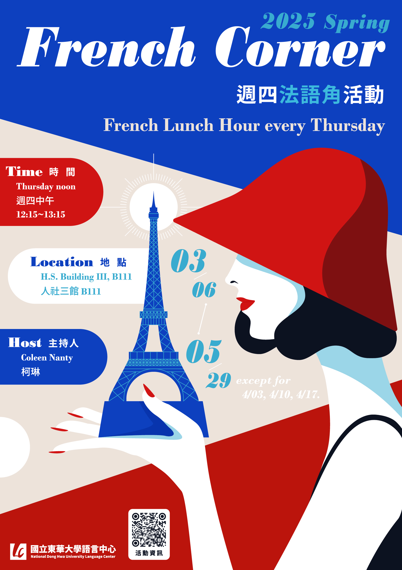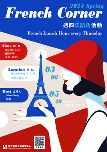 Come to join us for the final French Lunch Hour session this semester! Have a chat with our French assistant and enjoy some French snacks! ◆ Session 10 (Don't miss the last session for this semester!) When: 12:15--13:00, Thursday, May 29th, 2025 Where: Humanities Building 3, B111 * Sign up & walk-in participation are both welcome! * Snacks and beverages are served. * One hour of the cross-disciplinary self-learning credits https://sys.ndhu.edu.tw/SA/XSL_ApplyRWD/ActAnnounce.aspx?ActID=24871 本學期最後一場「French Lunch Hour」! 一起來跟法國助教聊聊天、享用法式點心吧! ◆ 第10場(本學期最後一場,千萬別錯過!) 時間:2025年5月29日中午12:15--13:00 地點:人社三館B111 * 事先報名與隨時加入都歡迎! * 提供飲料及點心(數量有限,請酌量拿取)。 * 可認證跨域自主學習時數1小時。 報名:https://sys.ndhu.edu.tw/SA/XSL_ApplyRWD/ActAnnounce.aspx?ActID=24871