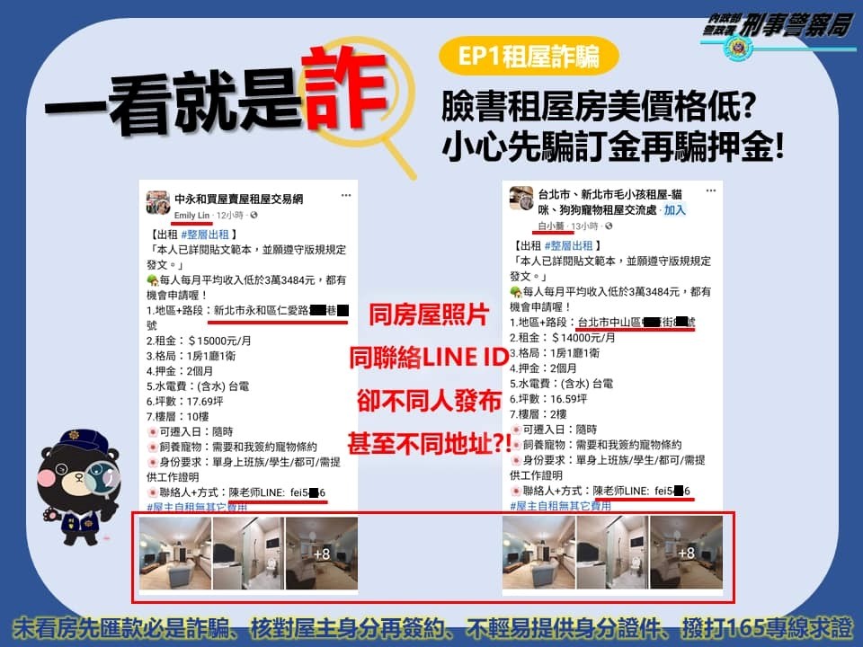 最後提醒同學……詐騙歹徒為了騙到更多錢,除了騙取房租,也會找租屋相關項目請同學代墊(水電費、網路、管理費……),切記,只要提到要同學代墊費用……基本上就是詐騙。