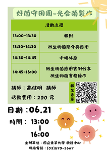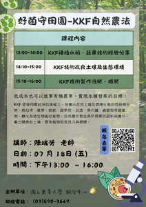 分類: 活動公告, 課程公告 來源: 技術服務中心 - 汪曉玲 - erin@gms.ndhu.edu.tw - 電話3507 對象: 全校教職員_全校學生_兼任教師_教職員眷屬 標題: 國立東華大學 驗證中心【6/21(六)及7/18(五)好菌守田園-系列課程活動】歡迎報名參加!! 日期: 2025-06-04  ( 星期三 )  17:43 附檔: 06.21好菌守田園-光合菌海報.png (388 KB)   06.21好菌守田園-KKF自然農法海報.png (4 MB)