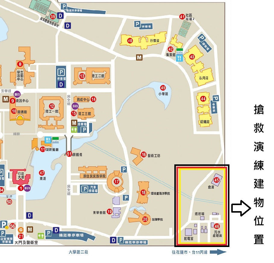 一、壽豐消防隊為實地了解本校各棟建築物緊急救災動線及測試消防設備,訂於114年6月9日(一)下午16-18時,擇定變電站、汙水處理廠、倉庫(檔案館)進行消防搶救演練。 二、演練範圍如圖說明,演練期間派有二部消防車及一部救護車,並於建物公共區域內佈設水線及逃生路徑等,不便之處敬請見諒。 總務處營繕組 敬啟