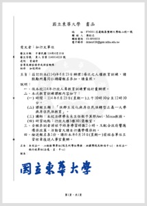 分類: 課程公告 來源: 人事室 - 陳旺志 - dchen829@gms.ndhu.edu.tw - 電話03-8906058 對象: 全校教職員 標題: 本校訂於114年6月23日(星期一)辦理人權教育訓練,請各位同仁踴躍參加。 日期: 2025-06-13  ( 星期五 )  11:43 附檔: 1140014228書函.pdf (320 KB)   本校114年6月行政人員政策性訓練報名表.odt (9 KB)