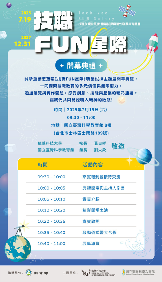 一、為推廣技職教育並強化社會大眾對技職體系之認識與肯定,龍華科技大學與國立臺灣科學教育館共同辦理「技職FUN星際」展覽活動,內容涵蓋科技創意、互動裝置等,並設有導覽與體驗區。 二、「技職FUN星際」展區開幕典禮資訊如下: (一)活動流程:詳如附件。 (二)活動時間:114年7月19日(星期六),上午10點至11點。 (三)活動地點:國立臺灣科學教育館八樓(台北市士林區士商路189號8F) (四)報名連結:https://reurl.cc/gRLvZ7 (五)報名日期:即日起至114年7月15日(星期二)止。 三、如有相關問題,請洽詢龍華科技大學研究發展處何效勁先生(電話:02-82093211轉3805;電子郵件:he334@gm.lhu.edu. tw)或蔡心慈小姐(電話:02-82093211轉3823;電子郵件:it047@gm.lhu.edu.tw)。 🔥更多徵才、就業、考試、實習、職涯講座訊息,請上學務處畢業生及校友服務組網站🔥 https://rb005.ndhu.edu.tw/p/412-1005-493.php