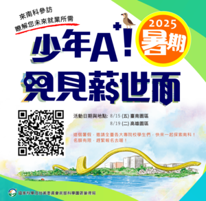 分類: 其他公告 來源: 學務處畢業生及校友服務組 - 黃文雯 - wenwen@gms.ndhu.edu.tw - 電話6283 對象: 全校教職員_全校學生 標題: 【轉知】國家科學及技術委員會南部科學園區管理局辦理2025「少年A+!見見薪世面」大學生暑期參訪活動 日期: 2025-07-09  ( 星期三 )  11:14 附檔: 南部科學園區管理局2025「少年A+!見見薪世面」DM.png (470 KB)