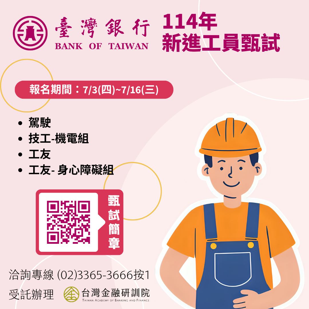 一、財團法人台灣金融研訓院受託辦理「臺灣銀行114年新進工員甄試」,預計合計正取51名,備取9名。 二、報名資訊摘述:(詳細資訊見簡章及甄試專區網站) (一) 甄試類別:駕駛、技工-機電組、工友、工友-身心障礙組 (二)報名期間:114年7月3日(星期四)10:00至7月16日(星期三)17:00截止,採網路報名,逾期恕不受理。 (三)測驗日期:第一試(筆試)日期:114年8月2日(星期六)。第二試(口試)日期:114年9月7日(星期日)。 (四)甄試專區:https://svc.tabf.org.tw/114bot03。 🔥更多徵才、就業、考試、實習、職涯講座訊息,請上學務處畢業生及校友服務組網站🔥 https://rb005.ndhu.edu.tw/p/412-1005-493.php