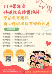 🌱 東華大學首次開設「特殊教育師資類科學前教育階段身心障礙組教育學程」,歡迎有志投入幼兒園特殊教育工作的同學報考! 這個學程屬於「特殊教育師資類科」,未來工作場域主要在幼兒園,培育您具備關懷、理解與專業能力,協助特殊需求幼兒安心學習、快樂成長。 📌 報考資格:113學年為本校大學部一年級以上或研究所碩、博士班,且113-2及114-1均為本校在學生(不含陸生),且在校修業年限尚有二年(4學期)(含)以上者。前述申請資格如下: (一) 本校大學部一年級以上在學學生:113學年度第1學期學業成績居該班排名前百分之七十者(依113-1名次證明書為準)。 (二) 研究所碩、博士班在學學生:113學年度第1學期學業總成績75分(含)以上者。 若提前於第二學期入學者,請提出入學前之大學或碩士成績單,並提出最後一學期班排名證明,大學學業成績平均需居該班名前百分之七十者。 (三) 歷年學期操行成績平均在八十分以上,且在申請截止前未受記過(含)以上處分者。 📌 申請時間:8月12日(一) 8:00 ~ 8月18日(一) 9:00 📌 繳交資料:書審資料及5分鐘個人影片 📌 筆試時間:9月5日(五) 10:00~11:00 📎線上報名網址 : https://web.ndhu.edu.tw/StudentEducationPSTH/login.aspx 📎 114學年度甄選簡章及相關資訊可參見師培中心網站:https://littletree.ndhu.edu.tw/p/406-1023-245517,r4421.php?Lang=zh-tw 📞 若有疑問請洽 : 師資培育中心國小、幼教與特教學程組:陳小姐(03-8906636) 114國小教育學程甄選專用E-mail:eleedu114@gms.ndhu.edu.tw 暑假期間依規定實施統一暑休日(詳見本校網站校務行事曆或師培中心網頁),該期間不提供現場或電話洽詢服務。建議考生避開暑休日來電或親洽,亦歡迎以電子郵件方式聯繫。 🌟 如果您喜歡與孩子相處、對特教有興趣,不妨把握這個機會,加入我們,成為改變孩子人生的那個人!
