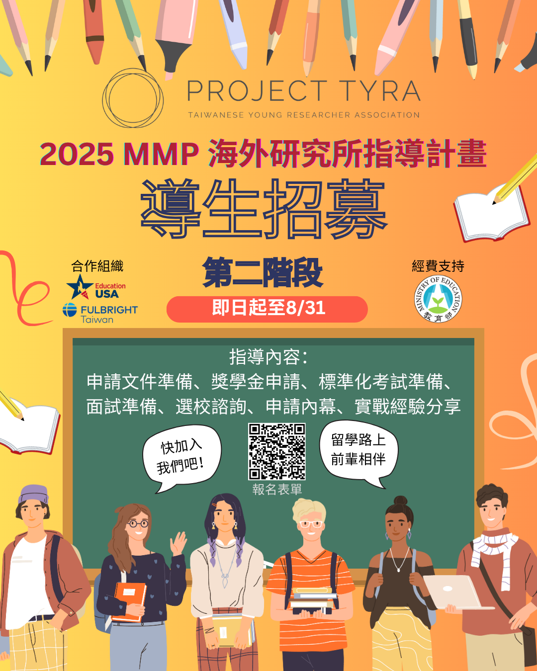 🕐 留學路上,有人陪你一起走,就不孤單 第一梯次導生媒合已順利完成,感謝來自全球超過 300 位導師熱情參與 TYRA Mentor-Mentee Program(MMP),許多導師在忙碌的教學與研究之餘,仍選擇額外收學生、無償指導,只為了讓更多來自台灣的年輕人,能少走一些彎路、多一些信心! 🎯 留學夢不該只是夢,Project TYRA 陪你走過最關鍵的一哩路 當AI工具讓申請文件看似更容易撰寫,卻也更容易落入千篇一律的窠臼。當你苦思研究動機、學術亮點時,也許最需要的,是一位曾經走過這條路的人,幫你校準方向、放大潛力、說出你故事中最打動人心的部分。 📌 在校成績與學術經歷短期內難以改變,申請文件成了關鍵突破口,因此更需要有經驗的導師協助,幫助你呈現最好的自己。 你的實力,加上他們的經驗與陪伴,將成就一條更有信心、更不孤單的申請之路。 🌍 他們走過的路,會是你未來的地圖 TYRA MMP 匯集來自美國、加拿大、英國、德國、瑞士、荷蘭、日本等地、涵蓋自然科學、生醫、工程、教育、藝術、人文社會等多元領域的導師,他們不只提供文件撰寫建議與選校策略,更能給你該國留學制度、產業趨勢與申請文化的第一視角,協助你用最適合自己的方式走向世界。 📣 第二梯次導生招募已啟動,開放至 8/31 止 - 媒合方式依照志願序與領域配對,9 月初陸續通知媒合結果 - 導師全程志工參與,活動全線上進行,無需費用 📍重要連結 📥 導生申請表單:https://forms.gle/TcWwsVoqyAdKrqdz8 📖 2025 第二梯次導師名單:https://shorturl.at/gnITz 🌐 活動總覽與說明:https://shorturl.at/Htdh0 ▶️ 留學講座資源與錄影:https://shorturl.at/alX2h 💡 本計畫由教育部支持,導師與導生皆無需負擔任何費用。讓我們一起用經驗消弭資訊差,串聯全球台灣人才,幫助更多人勇敢前行,實現留學夢! ✨ 歡迎分享給正在準備海外研究所申請的朋友,我們希望這份資源,能被需要的人看見。