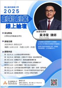 想創業卻總覺得法律好複雜?別擔心!這次論壇將用「新創法律地圖」的方式,帶你一次看懂創業過程中必知的法律重點,幫助你避開風險、布局未來!✨ 🎯 活動資訊 ▍主題:114 學年度創新創業線上論壇 ▍講者:立勤國際法律事務所 黃沛聲 主持律師 (擁有近 18 年輔導新創企業的實務經驗,將分享不同規劃選擇對企業經營的深遠影響) ▍對象:大專院校教職員及學生 ▍時間:2025 年 9 月 10 日至 12 月 24 日,每場 12:00–13:30 (原則上隔週三授課,共 8 場,詳細日期請參見附件) ▍方式:Google Meet 線上授課 ▍報名連結:https://forms.gle/VTiHbLNM5c9ZmkjF7 📌 貼心提醒 課程將深入剖析創業過程中的法律議題,無論你是正在創業,或是對未來有興趣的師生,都非常適合參加! — 🌱 一起在創業的道路上走得更穩健,這場論壇將是你不可錯過的機會! 【本活動非育成中心辦理,僅協助轉發相關資訊,詳情請洽辦理單位】