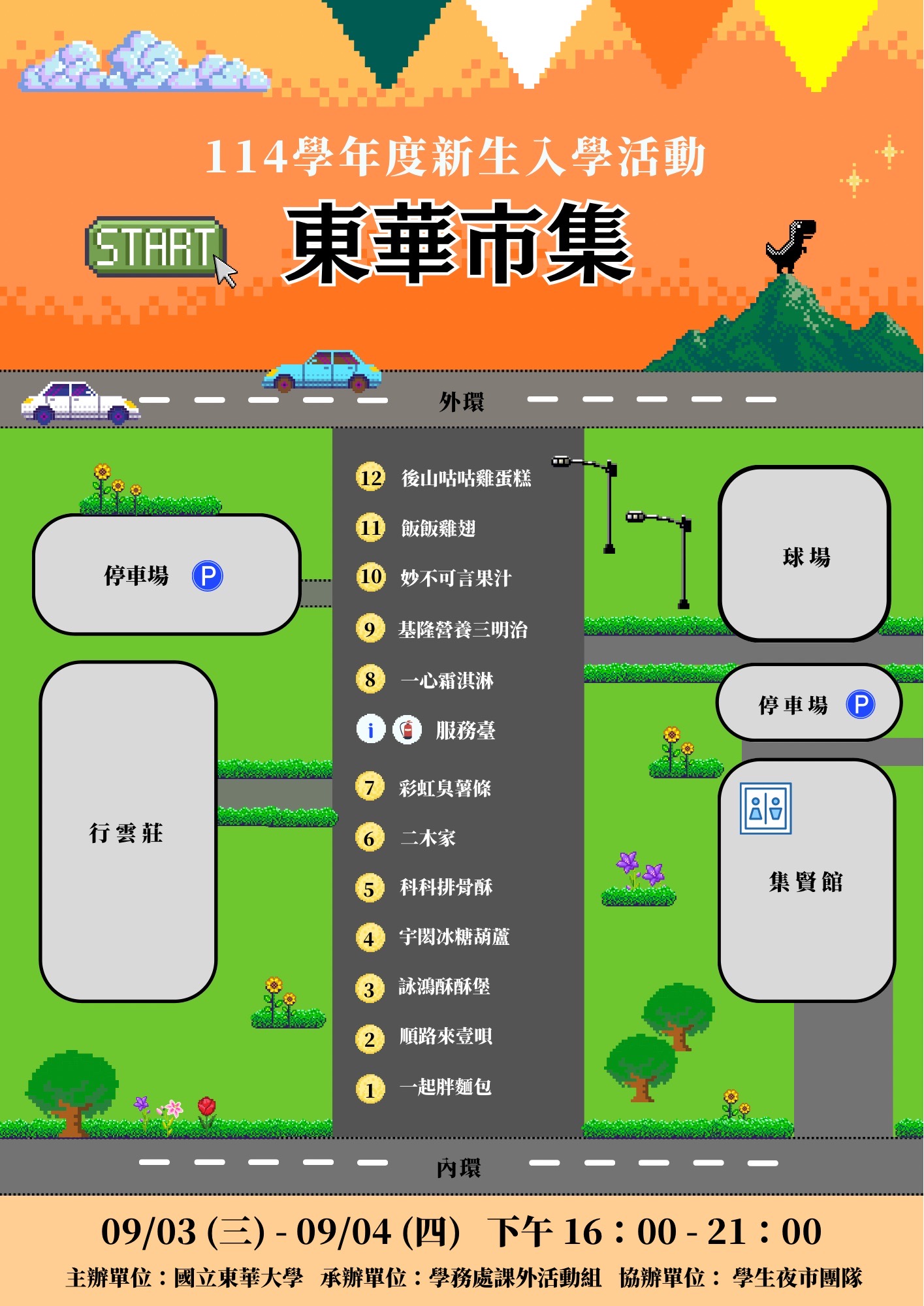 為了歡迎新生加入東華的大家庭! 在今年新生營的兩個夜晚,我們特別推出「東華市集」,讓剛踏入東華的新鮮人,直接感受到東華獨有的夜市特色✨ 這裡集結了各式美味:隨手就能嗑的小吃、不同品項讓您一次擁有…讓您一逛就停不下來! 不論您是剛踏進校園的新鮮人,還是已經熟悉在東華的老朋友,快揪上您的同學、朋友,一起來市集走跳~🙌🏻 FB:https://www.facebook.com/share/18c5Zea14Z/?mibextid=LQQJ4d IG:https://www.instagram.com/ndhu_nightmarket?igsh=Mm5lMTVheDRub2Vu 📌PS.攤位圖及海報如附件 時間:9/3(三)~9/4(四)16:00-21:00 地點:行雲莊和集賢館間道路 ————————————————————————————————— 主辦單位:學生事務處 承辦單位:課外活動組 協辦單位:學生夜市團隊 ⚠️注意事項: 行雲莊和集賢館間道路為因活動攤商擺攤位置及活動參與者用路人安全考量,故於活動當日做為管制範圍。