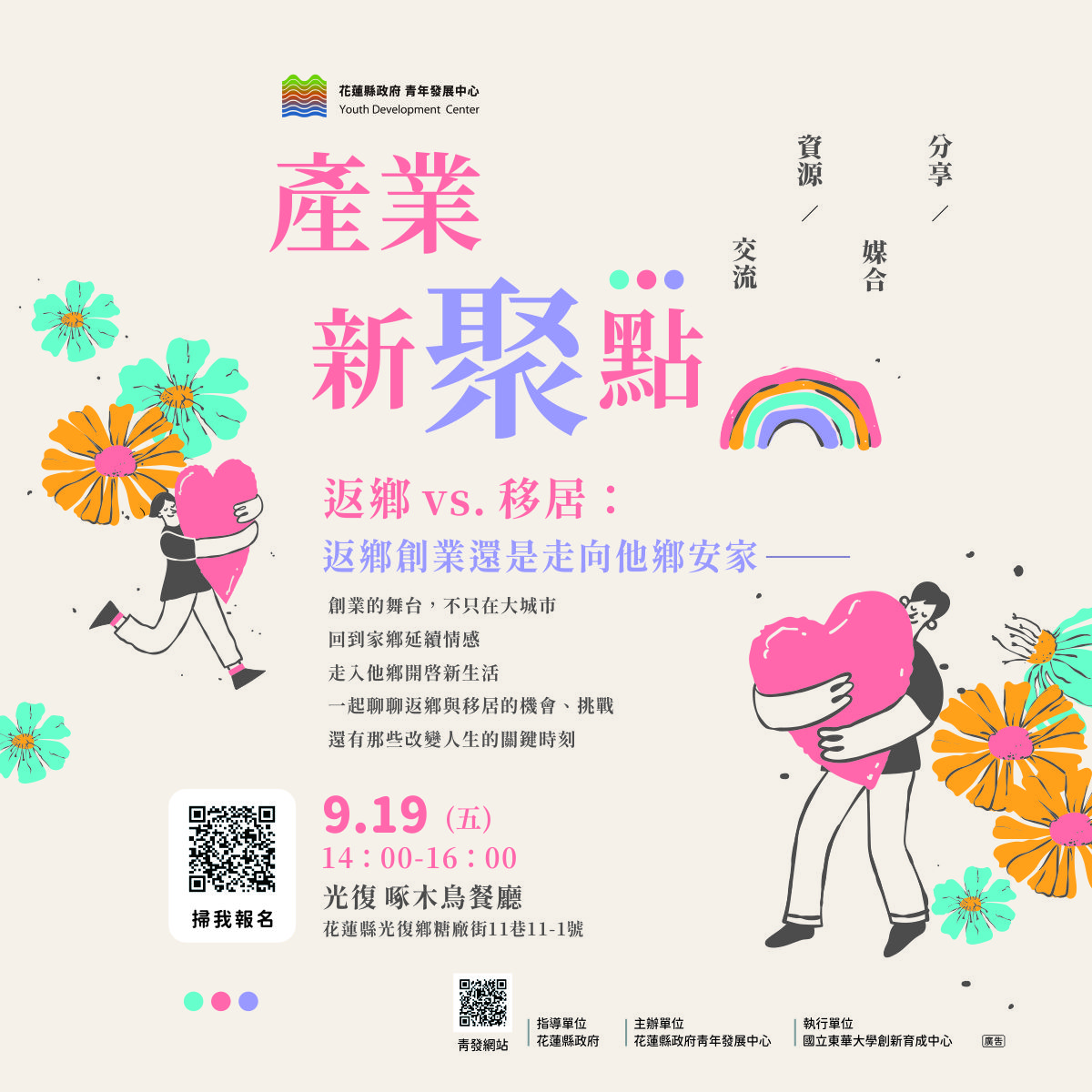 【返鄉 vs. 移居:返鄉創業還是走向他鄉安家】 創業一定要在大城市嗎? 隨著型態趨於多元,越來越多創業者選擇走向鄉鎮與社區 在節奏更自在、文化更鮮明的土地上展開新旅程 有人返鄉,把創業視為與家鄉情感的延續 有人移居,在陌生土地中尋找理想生活與工作的平衡 從文化適應、人脈建立,到資源取得與生活調整 每一步都是挑戰,也是重新定義人生藍圖的契機 本次交流邀請不同背景的創業者 分享他們如何在「返鄉」與「移居」的抉擇中找到自己的答案 一起傾聽真實故事、對話經驗與感受 思考創業地點與理想生活的可能性,並在交流中碰撞更多連結與啟發 |分享者| 👤 徐婉玉 |玩藝樹有限公司 負責人 以傳統樹皮為根基,透過融合當代生活需求,發展出獨具特色的工藝品。創辦人將樹皮工藝轉化為可親身體驗的文化旅程,打造兼具傳承、療癒與永續價值的品牌。 👤 陳汪妏璟 | 花子好食卓溪果醬 創辦人 因疫情導致卓溪夏雪芒果滯銷,農民血本無歸,甜美果實卻被迫浪費。布農族女孩陳汪妏璟憑藉行銷專長,決心改善現況,開啟果醬製作之路,並創立「花子好食」,以分享花東土地的美好滋味。 【活動日期】114年9月19日 (五) 14:00-16:00 【交流地點】光復 啄木鳥餐廳(花蓮縣光復鄉糖廠街11巷11-1號) 【報名網址】https://forms.gle/CYA72xwaMTr52FKH7 ------------------------------------------------------------------------------ 【不只賣東西,賣的是一種感覺-打開創業的感性視角】 當產品價格、功能不再是唯一的選擇依據 「情感連結」正成為品牌能否被記住的關鍵 現代消費者期待的不只是商品 而是一種能觸動人心的共鳴與生活認同 創業者如何跳脫單純銷售的思維 打造能讓人產生記憶點與感受的品牌體驗 本次交流邀請具備品牌實戰經驗的創業者 分享他們如何從自身價值出發,透過故事、靈感與設計語言 把品牌轉化為一種感覺、一種生活體驗。 一起思考與交流 探索品牌如何在情感連結中 展現真實、觸動人心並留下深刻印象 |分享者| 👤 林廷瑀|女兒不懂茶創辦人 台東鹿野第二代茶農,以「女兒不懂茶」重新詮釋茶的日常價值 結合設計力與故事感,將紅烏龍風味延伸至產品命名、包裝、文案與音樂,打造多感官的情境式品茶體驗。從改造家中車庫到縱谷沉浸空間,她讓人「用感覺喝茶」,以土地、文化與情感為核心,實踐地方創業的嶄新可能。 👤 林志豪(武撒恩・卡羅)|打個蛋海旅事業群執行長 以多年旅館業經驗返鄉創立「打個蛋海旅」,取名自排灣語 Dagedan(睡覺),營造無電視、伴書香與海風的沉靜空間。將民宿視為地方共感的媒介,從書樂、野餐到咖啡細節,引導旅人放慢步調,不只是經營住宿,而是實踐一種貼近土地、感性且慢活的生活體驗。 【活動日期】114年9月30日 (二) 14:00-16:00 【交流地點】 好。咖啡(花蓮縣吉安鄉自強路476號) 【報名網址】https://forms.gle/SXzwxpr1gdcQ49qv8