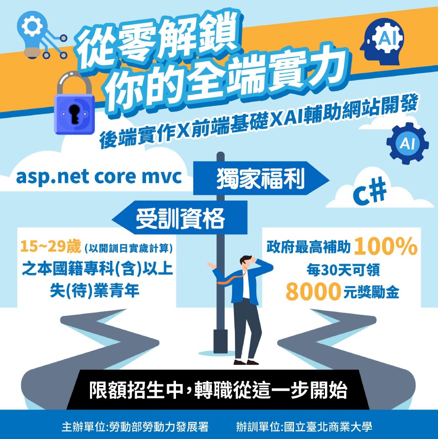 一、國立臺北商業大學資訊管理系商業智慧研究中心承辦勞動部勞動力發展署產業新尖兵計畫,協助勞動部進行失待業青年(含應屆畢業生)職業訓練,培養跨領域專長,透過職業訓練課程輔導就業協助轉職。 二、符合資格條件及規定者,政府全額補助訓練費用,訓練期間每人每月最高可領八千元學習獎勵金。 三、課程相關資訊: (一)開訓日期:114年10月30日(星期四)。 (二)結訓日期:115年02月10日(星期二)。 (三)課程時數:427小時。 (四)上課時間:平日周一~周五 9:00~17:00(中間午休1小時)。 (五)訓練地點:國立臺北商業大學(臺北校區)_台北市中正區濟南路一段321號。 四、課程聯繫窗口:國立臺北商業大學資訊管理系商業智慧研究中心陳小姐。 五、課程諮詢專線:(02)2322-6490,Line諮詢官方帳號:@914fhelz,加入連結:https://lin.ee/3KHxoqT 🔥更多徵才、就業、考試、實習、職涯講座訊息,請上學務處畢業生及校友服務組網站🔥 https://rb005.ndhu.edu.tw/p/412-1005-493.php