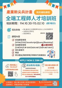 分類: 其他公告 來源: 學務處畢業生及校友服務組 - 黃文雯 - wenwen@gms.ndhu.edu.tw - 電話6283 對象: 全校教職員_全校學生 標題: 【轉知】國立臺北商業大學產業新尖兵計畫「全端工程師人才培訓班(第7梯次)」 日期: 2025-09-03  ( 星期三 )  18:21 附檔: 國立臺北商業大學產業新尖兵計畫「全端工程師人才培訓班(第7梯次)」招生簡章.pdf (851 KB)   國立臺北商業大學產業新尖兵計畫「全端工程師人才培訓班(第7梯次)」DM1.jpg (426 KB)   國立臺北商業大學產業新尖兵計畫「全端工程師人才培訓班(第7梯次)」DM2.jpg (201 KB)