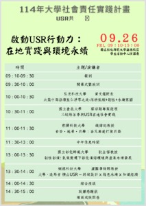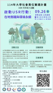 大家好, 協助轉知國立彰化師範大學啟動USR行動力:在地實踐與環境永續」跨校SIG活動。有意參加者,請自行報名。謝謝。 活動介紹 本活動匯聚於地區深耕實踐具代表性的USR計畫團隊,透過其結合專業知識回應在地需求、推動地方發展與培育在地人才之歷程,分享具體成果與關鍵經驗。 活動資訊: (一)活動時間:114年9月26日(星期五)09:10-15:00。 (二)活動地點:國立彰化師範大學進德校區學生活動中心1樓演講廳。 (三)活動對象:全國大專校院大學社會責任計畫團隊或對議題有興趣之教職員生及在地社會人士。 (四)報名網址:https://forms.gle/wiwsKKwrhXpdiwBr9 (五)活動流程:如附件。 聯絡人:「韌性彰濱:氣候變遷下彰化濱海環境與產業永續計畫」承辦團隊, 電話:04-7232105分機3456 E-mail:qu15482z@cc.ncue.edu.tw 李莉莉 Li-Li Lee 國立東華大學 永續發展中心 治理策略組 Governance and Strategy Division, Center for Sustainable Development, National Dong Hwa University 電話 Tel:+886-3-890-5920 電子郵件 E-mail:sd@gms.ndhu.edu.tw 網址 Website:https://sdgs.ndhu.edu.tw/