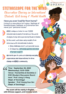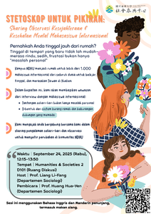 (English & Indonesian information as below) [心靈聽診器|東華國際學生福祉與心理健康觀察分享] 你有過離鄉背井求學的經驗嗎? 在異地生活、讀書的過程中,思念、悲傷或沮喪從來不是一個人的問題。 打造國際學生友善的校園,需要每一位東華人的關心與行動。 東華校園目前有超過一千位國際學生,來自世界各國,在花蓮讀書、生活與體驗台灣的同時,也面臨文化差異與制度支持不足所帶來的挑戰。本次分享會邀請社會學系黃華彥副教授,透過訪談與研究,帶來他對國際學生心理健康與福祉的初步觀察,並指出這些挑戰其實反映了制度與結構的不足。 我們邀請所有關心國際學生心理健康與校園友善環境的同學與老師,一起參與討論,從日常經驗出發,推動改變。 📅 活動資訊 時間|2025 年 9 月 24 日(三 )12:15–13:50 地點|人文社會二館D101(諮商系研究生討論室) 主持人|梁莉芳 副教授 (Dept. of Sociology) 講者|黃華彥 副教授 (Dept. of Sociology) 語言|以英文為主,中文輔助 報名方式|跨域自主學習系統報名(請掃描 QR Code) https://sys.ndhu.edu.tw/SA/XSL_ApplyRWD/ActApply.aspx?ActID=26739 貼心提醒 Reminder|現場備有簡易午餐,可於簡報室外享用 ______________________________________________________________________________ [Stethoscope for the Mind: Observation Sharing on International Students’ Well-being & Mental Health] To foster a more supportive and inclusive campus for international students’ mental health, we warmly invite you to join the upcoming session: Stethoscope for the Mind: Observation Sharing on International Students’ Well-being & Mental Health. In this talk, Prof. Huang Hua-Yen (Dept. of Sociology) will share his research observations on international students, revealing how daily struggles could be shaped by systemic and institutional challenges. Through this dialogue, we hope to raise awareness of students’ needs and inspire actions for a more caring NDHU community. 📅 Event Details Time|2025.09.24(Wed)12:15–13:50 Venue|Humanities & Societes 2 D101 (Student Discussion Room) Host|Prof. Liang Li-Fang (Dept. of Sociology) Speaker|Prof. Huang Hua-Yen (Dept. of Sociology) Language|Mainly in English, with Chinese support Registration| Register via Interdisciplinary Self-Learning System (Scan QR Code) https://sys.ndhu.edu.tw/SA/XSL_ApplyRWD/ActApply.aspx?ActID=26739 Reminder| Lunch will be available outside the seminar room. ______________________________________________________________________________ [Stetoskop untuk Pikiran: Sharing Observasi Kesejahteraan & Kesehatan Mental Mahasasiswa Internasional] Untuk menciptakan kampus yang lebih suportif dan inklusif bagi kesehatan mental mahasiswa internasional, kami dengan hangat mengundang Anda untuk bergabung dalam sesi mendatang: Stetoskop untuk Pikiran: Sharing Observasi Kesejahteraan & Kesehatan Mental Mahasiswa Internasional. Dalam sesi ini, Prof. Huang Hua-Yen (Departemen Sosiologi) akan berbagi observasi penelitiannya tentang mahasiswa internasional, mengungkap bagaimana tantangan sehari-hari dapat dibentuk oleh tantangan sistemik dan institusional. Melalui sesi ini, kami berharap dapat meningkatkan kesadaran akan kebutuhan mahasiswa dan menginspirasi tindakan untuk komunitas NDHU yang lebih peduli. 📅 Detail Kegiatan Waktu|2025.09.24(Rabu)12:15–13:50 Tempat|Humanities & Societes 2 D101 (Ruang Diskusi) Host|Prof. Liang Li-Fang (Departemen Sosiologi) Pembicara|Prof. Huang Hua-Yen (Departemen Sosiologi) Bahasa|Inggris, dengan Mandarin (penunjang) Registration| Daftar via sistem Interdisciplinary Self-Learning (Pindai QR Code) https://sys.ndhu.edu.tw/SA/XSL_ApplyRWD/ActApply.aspx?ActID=26739 Perlu Diingat| Tersedia makan siang di luar ruang seminar.