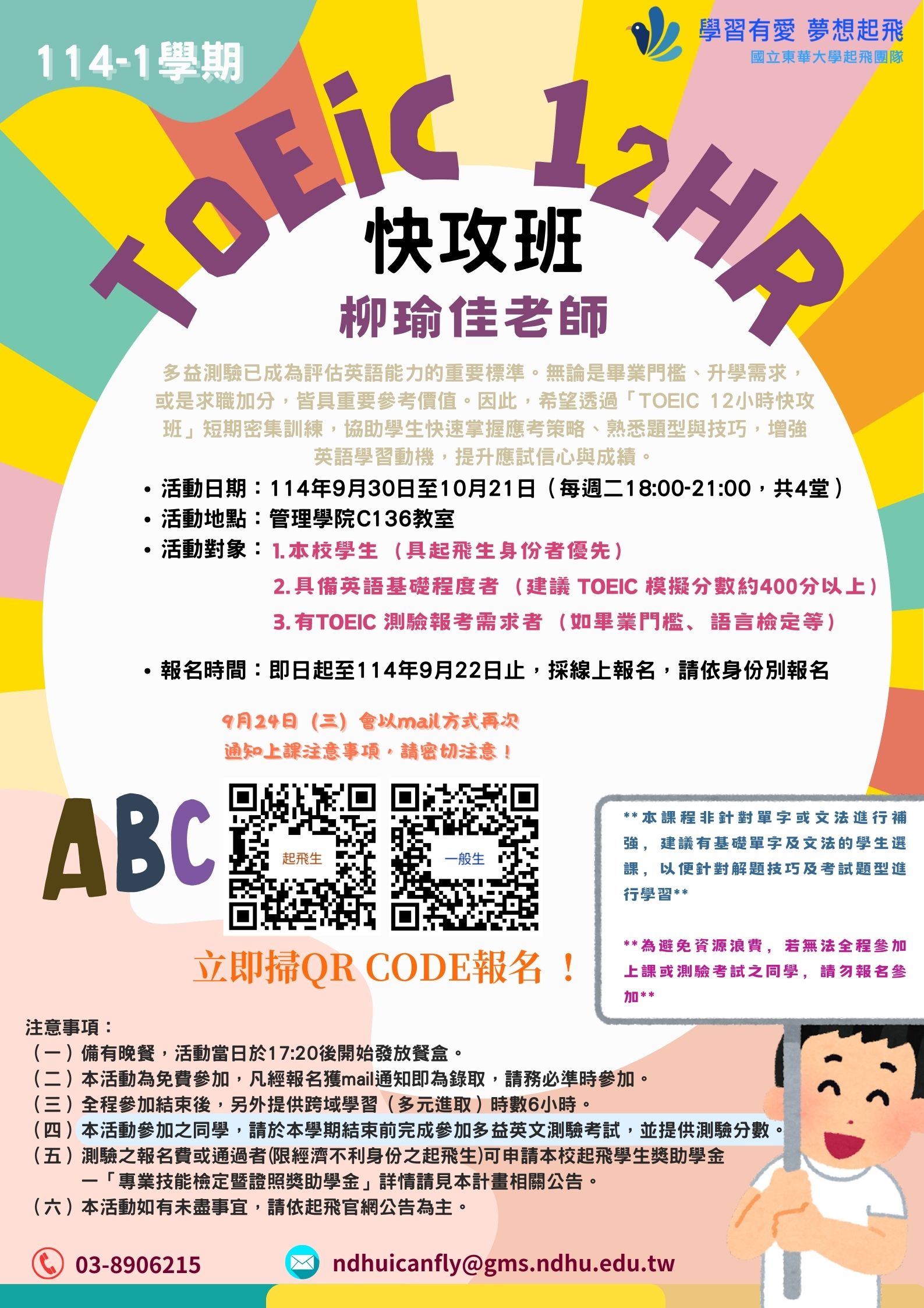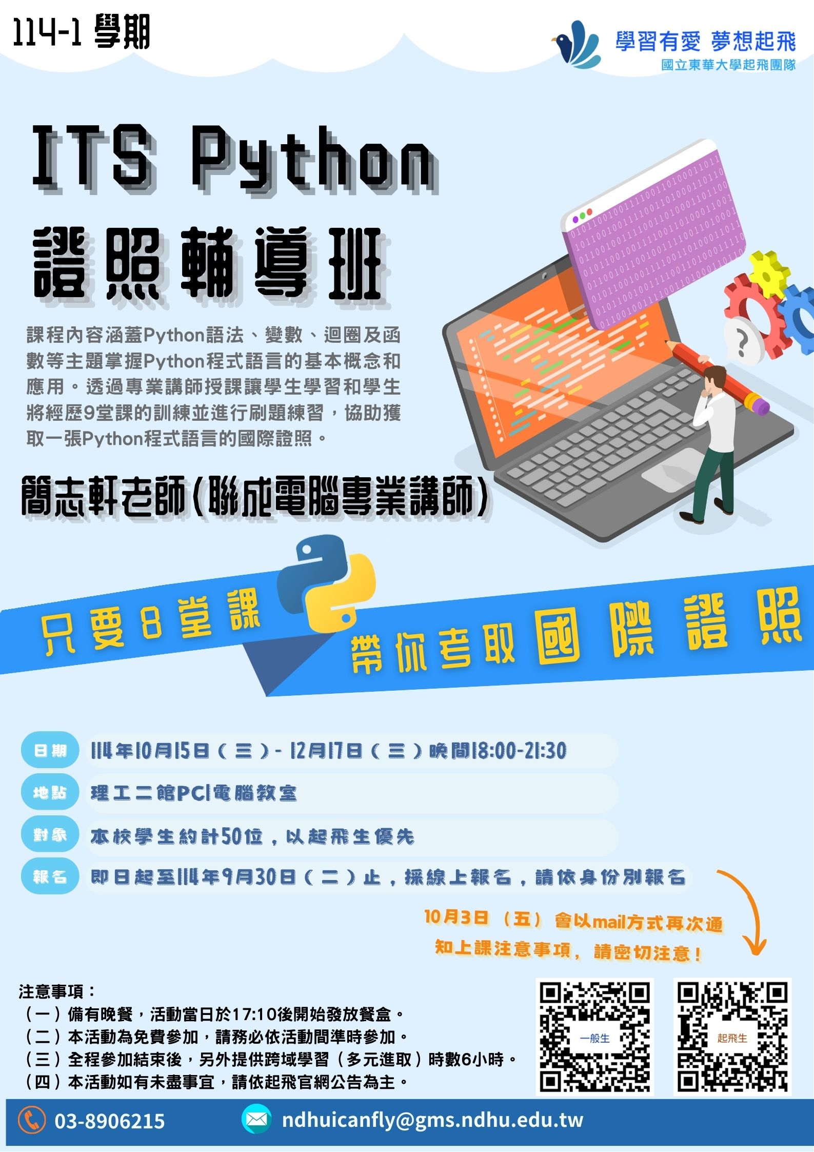 分類: 活動公告, 課程公告 來源: 學務處 - 鄭小姐 - ting@gms.ndhu.edu.tw - 電話8906215 對象: 全校教職員_全校學生_大二 標題: 📢📢114-1學期【起飛免費學習輔導課程,精彩好康不容錯過,快來把握機會!】🔥🔥 日期: 2025-09-05  ( 星期五 )  09:53 附檔: AI工具.jpg (683 KB)   python.jpg (456 KB)   TOEIC.jpg (469 KB)