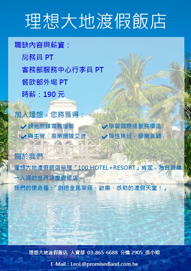 🏨 關於我們 理想大地渡假飯店榮獲「100 HOTEL+RESORT」肯定,為台灣唯一入選的世界級度假飯店。 想在花蓮最美的度假飯店工作嗎? 想累積服務經驗、提升語言能力,同時享受大自然的環境氛圍? 理想大地渡假飯店誠摯邀請你加入! 💡也歡迎具備中文溝通能力僑外生應徵喔!💡 💼 職缺內容 房務員 PT 客務部服務中心 PT 餐飲外場 PT 💲時薪:190元 ✨ 加入理想大地,你將收穫: ✔ 觀光旅館實務經驗 ✔ 學習國際級服務標準 ✔ 與主管、專業團隊交流 ✔ 彈性排班,學業兼顧 👉有興趣應徵工讀同學請填妥附件履歷表後,以電子郵件寄至leol@promisedland.com.tw 人資部 🔥更多徵才、就業、考試、實習、職涯講座訊息,請上學務處畢業生及校友服務組網站🔥 https://rb005.ndhu.edu.tw/p/412-1005-493.php