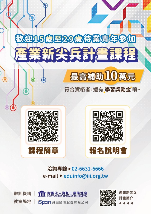 一、勞動部為鼓勵15歲至29歲之本國籍待業青年,培養產業人才關鍵技能,並協助青年追求理想職涯及就業即戰力,提供「產業新尖兵計畫」訓練課程,最高補助10萬元訓練費用;參訓青年符合條件者,另可申請每月8,000元學習獎勵金,最高累計9萬6千元;產業新尖兵計畫簡介詳見:https://elite.taiwanjobs.gov.tw/eNews/Detail?EN_ID=1。 二、該會於臺北、臺南及高雄等地,辦理旨揭產業新尖兵計畫之就業養成班補助課程,歡迎有幸趣者報名參加。 三、該會產業新尖兵計畫訓練課程相關資訊:(一)課程簡章,詳見網址:https://reurl.cc/ZNMeQW (二)課程說明會,報名網址:https://reurl.cc/ZNMeGM (三)洽詢專線:02-6631-6666;e-mail:eduinfo@iii.org.tw 🔥更多徵才、就業、考試、實習、職涯講座訊息,請上學務處畢業生及校友服務組網站🔥 https://rb005.ndhu.edu.tw/p/412-1005-493.php