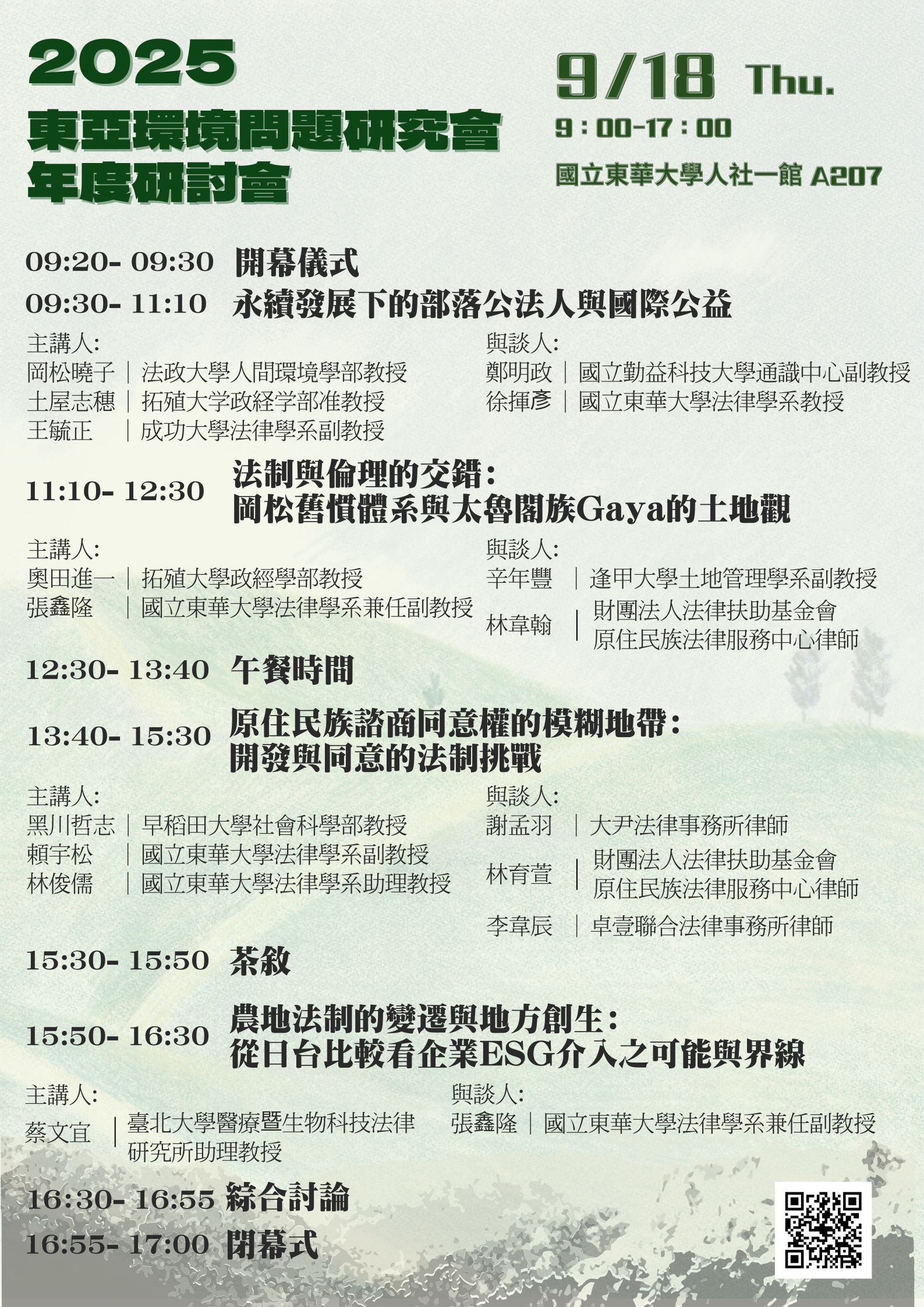 自2020年8月成立以來,東亞環境問題研究會已邁入第五年,藉由持續關注台灣與日本的環境議題與原住民族權益,致力於透過雙邊學術對話與實務交流,深化台日兩地在法政、社會與人權領域的連結。 📣 2025年度研討會主題為:「資源開發與原住民族權利」 為強化地方連結與法政實踐,本次研討會由東華大學法律學系與花蓮律師公會共同主辦,期盼透過在地觀察與交流,深化法律與政策的實務對話。 ★時間:114年9月18日(星期四) 09:00~17:00 ★地點:國立東華大學 人社一館A207 ★活動報名連結|https://forms.gle/TTxsZ3WwTwbaiY4M9 ★主辦單位:東亞環境問題研究會、國立東華大學法律學系 ★合辦單位:花蓮律師公會 ★協辦單位:拓殖大學政經學部、早稻田大學社會科學部、法政大學人間環境學部、逢甲大學土地管理學系、臺北大學醫療暨生物科技法律研究所、國立成功大學法律學系 ---- ★有跨域時數「專業成長6小時唷」 報名網址:https://sys.ndhu.edu.tw/SA/XSL_ApplyRWD/ActAnnounce.aspx?ActID=26877