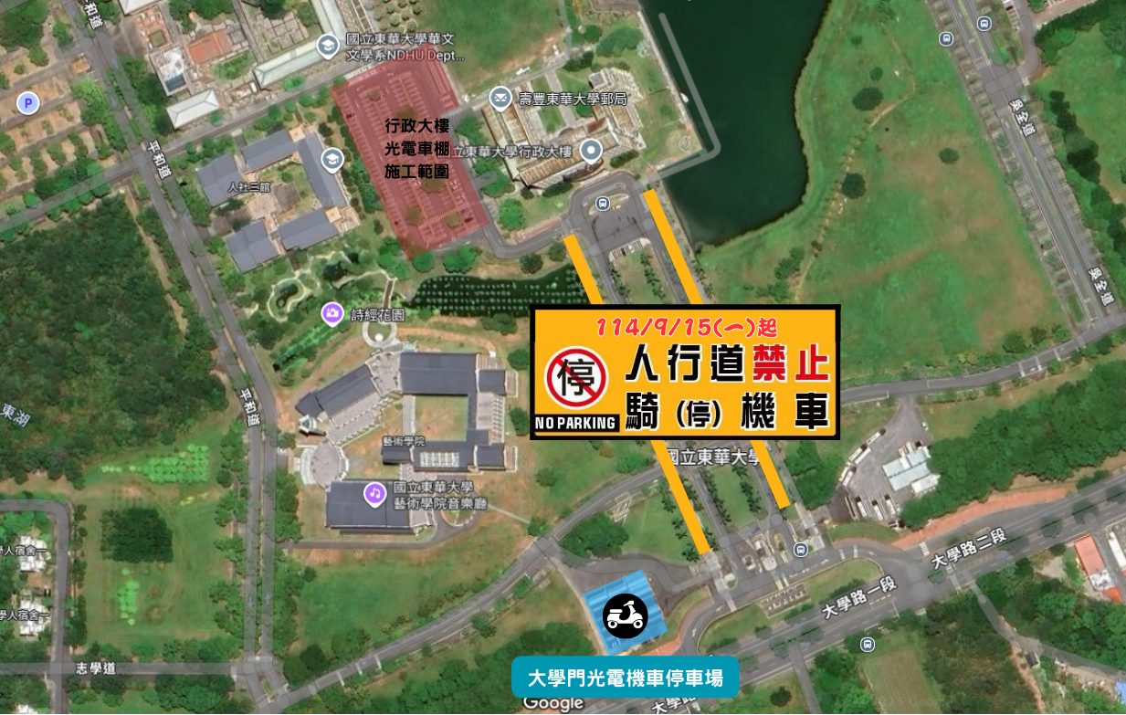 一、大學門左側機車停車棚,將於114年9月15日(星期一)開放停車,自該日起,原提供之施工期間替代停車地點將同步取消(如附圖)。請將機車停放於新設機車棚內,未依規定停放,將逕行予取締拖吊。 二、聯絡窗口: (一)施工廠商:得禾能源股份有限公司 1、工務負責人:張淵承 電話:0938-392-776 2、工務主任:陳瑞銘 電話:0970-876-932 (二)本校承辦人:張宗玲 電話:03-8906377 三、營繕組施工公告查詢:https://ga.ndhu.edu.tw/p/412-1006-17146.php?Lang=zh-tw