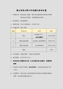 分類: 活動公告 來源: 人事室 - 劉昱淩 - e56187@gms.ndhu.edu.tw - 電話890-6056 對象: 全校教職員 標題: 檢送本校114年度藝文參訪計畫,請各單位同仁踴躍報名參加。 日期: 2025-09-15  ( 星期一 )  14:13 附檔: 1140915_114年度藝文參訪計畫_簽准(計畫及報名表).pdf (78 KB)