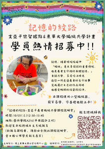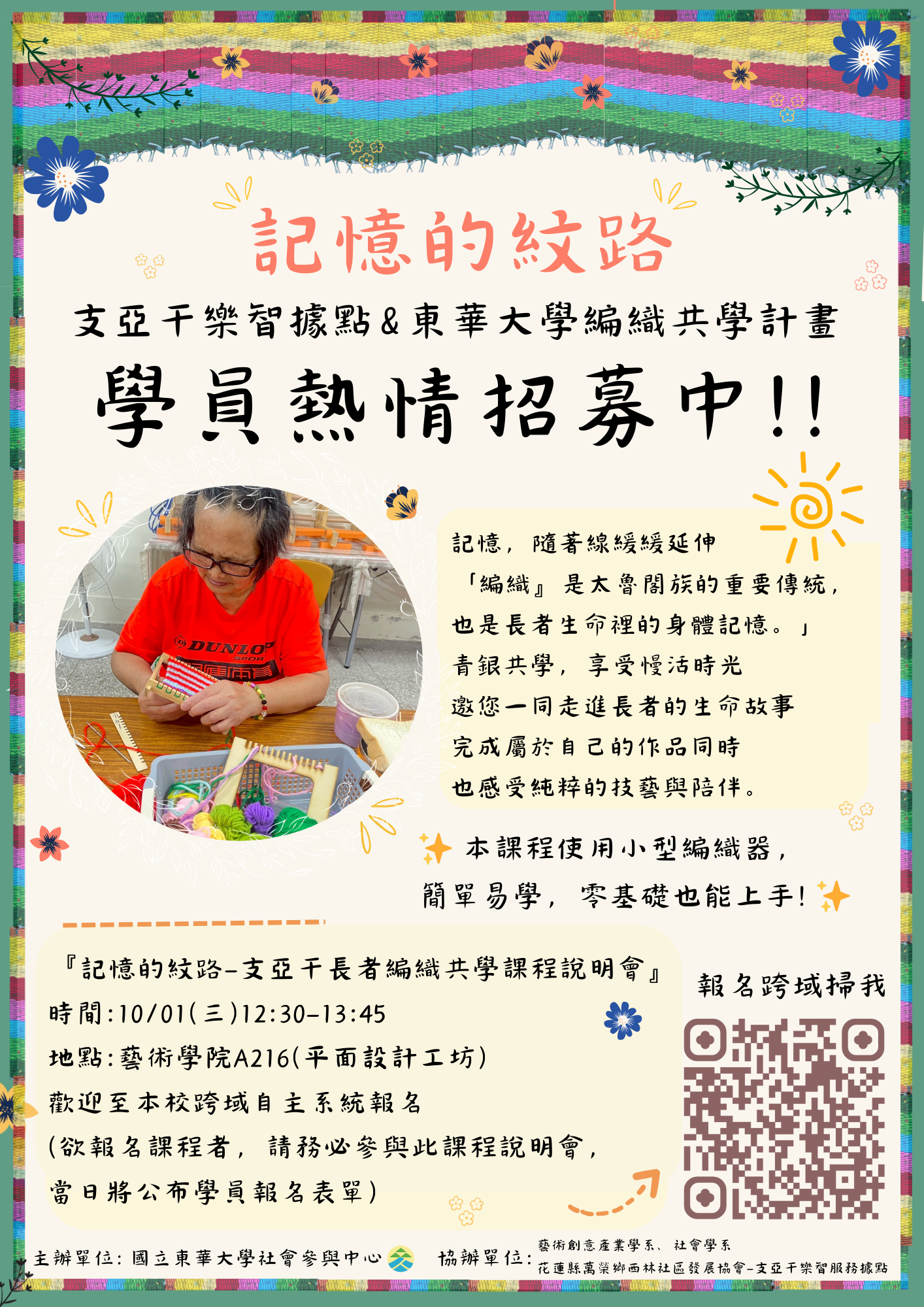 🧶記憶的紋路——支亞干長者編織共學課程🧶 ✾課程說明會,報名中❃ 🎙️由「支亞干樂智據點」姬望老師與大家說明課內容與注意事項 ⌓⎯⎯⌓⎯⎯⌓⎯⎯⌓⎯⎯⌓⎯⎯⌓⎯⎯⌓⎯⎯⌓ 記憶,隨著線緩緩延伸——「編織」承載著太魯閣族的重要傳統,也是長者生命裡不曾褪去的身體記憶。 ⌓⎯⎯⌓⎯⎯⌓⎯⎯⌓⎯⎯⌓⎯⎯⌓⎯⎯⌓⎯⎯⌓ 🌿青銀共學,享受慢活時光,邀您一同走進長者的生命故事,完成屬於自己的作品同時,也能感受純粹的技藝與真摯的陪伴。🌿 🧶 在偏鄉部落中,失智長輩的照顧需求日益增加,他們雖因認知退化而在日常生活上有所困難,但依然保有豐富的生活經驗與文化智慧。編織是太魯閣族重要的傳統技藝之一,對許多長輩來說,不只是手工,更是一種「身體的記憶」。本課程透過「編織」作為媒介,讓失智長輩透過自己熟悉的手藝,進行簡單的教導與記憶分享;同時,讓東華大學學生在陪伴與學習的過程中,理解失智症不同病程可能出現的狀況,並體驗跨世代交流的溫度。 🧶說明會報名(跨域系統):https://shorturl.at/fdhfr 或掃描海報QR code 活動認證領域:多元進取 1 小時 □⎯⎯□⎯⎯□⎯⎯□⎯⎯□⎯⎯□⎯⎯□ 以下為課程內容(非說明會內容) 📌 課程報名規定 1. 課程報名表單將於說明會中公布。 2. 欲報名課程者,務必參加課程說明會,未能出席者將不予錄取。 3. 限東華大學在校生報名。 4. 若報名人數超過15位,主辦單位將以參加者報名動機篩選(於報名表單中填寫)。 5. 將以email通知錄取結果。 6. 全程參與每堂課程者,課程結束後可獲得 「多元進取時數 12 小時」。 7. 課程日期:10/17(五)、10/31(五)、11/14(五)、11/28(五)、12/12(五)。 (以上為隔週五) 8. 課程時間: 上午10:00-12:00 9. 預計於 12/19至12/26 舉辦成果展,錄取學員須參與展覽佈置,無法參加者恕不錄取。 10. 錄取後,若缺席課程達 3 次,將不得繼續參與後續課程,亦不予時數。 □⎯⎯□⎯⎯□⎯⎯□⎯⎯□⎯⎯□⎯⎯□ 主辦單位:國立東華大學社會參與中心 協辦單位:社會學系、藝術創意產業學系、花蓮縣萬榮鄉西林社區發展協會——支亞干樂智服務據點