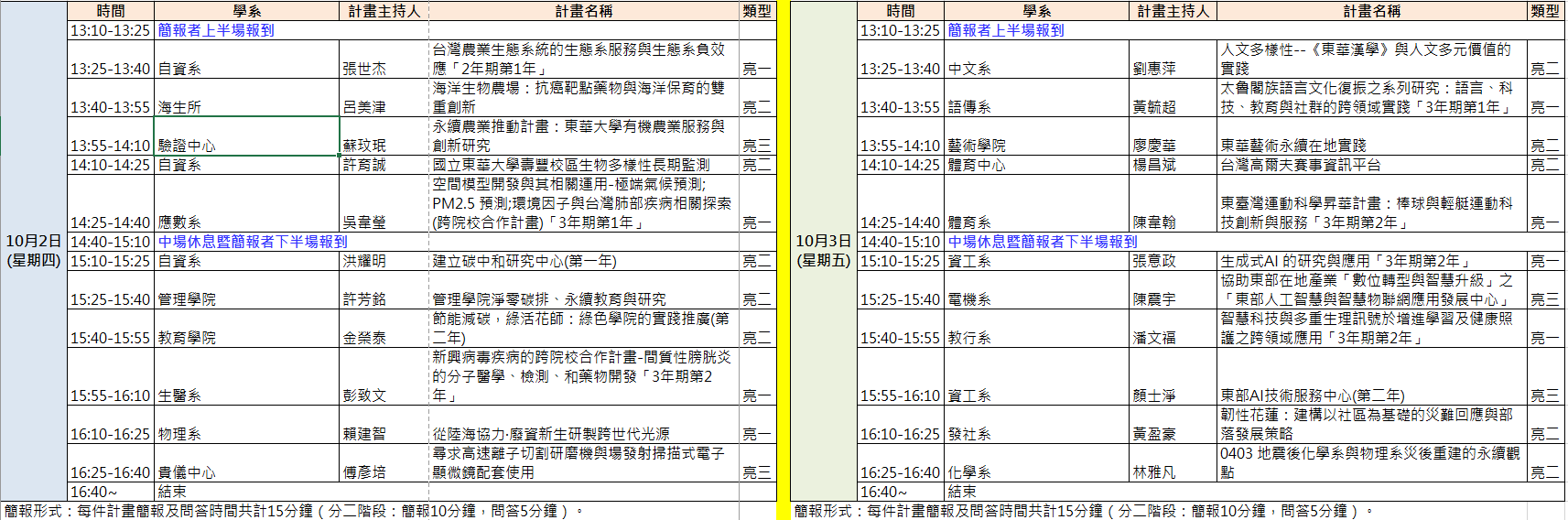 為促進校內師生交流與亮點計畫推動成果之分享,本校將於**114年10月2日(四)及10月3日(五)兩日下午時段**於行政大樓4樓416會議室舉辦「亮點計畫交流會」,誠摯邀請全校師生踴躍參與!