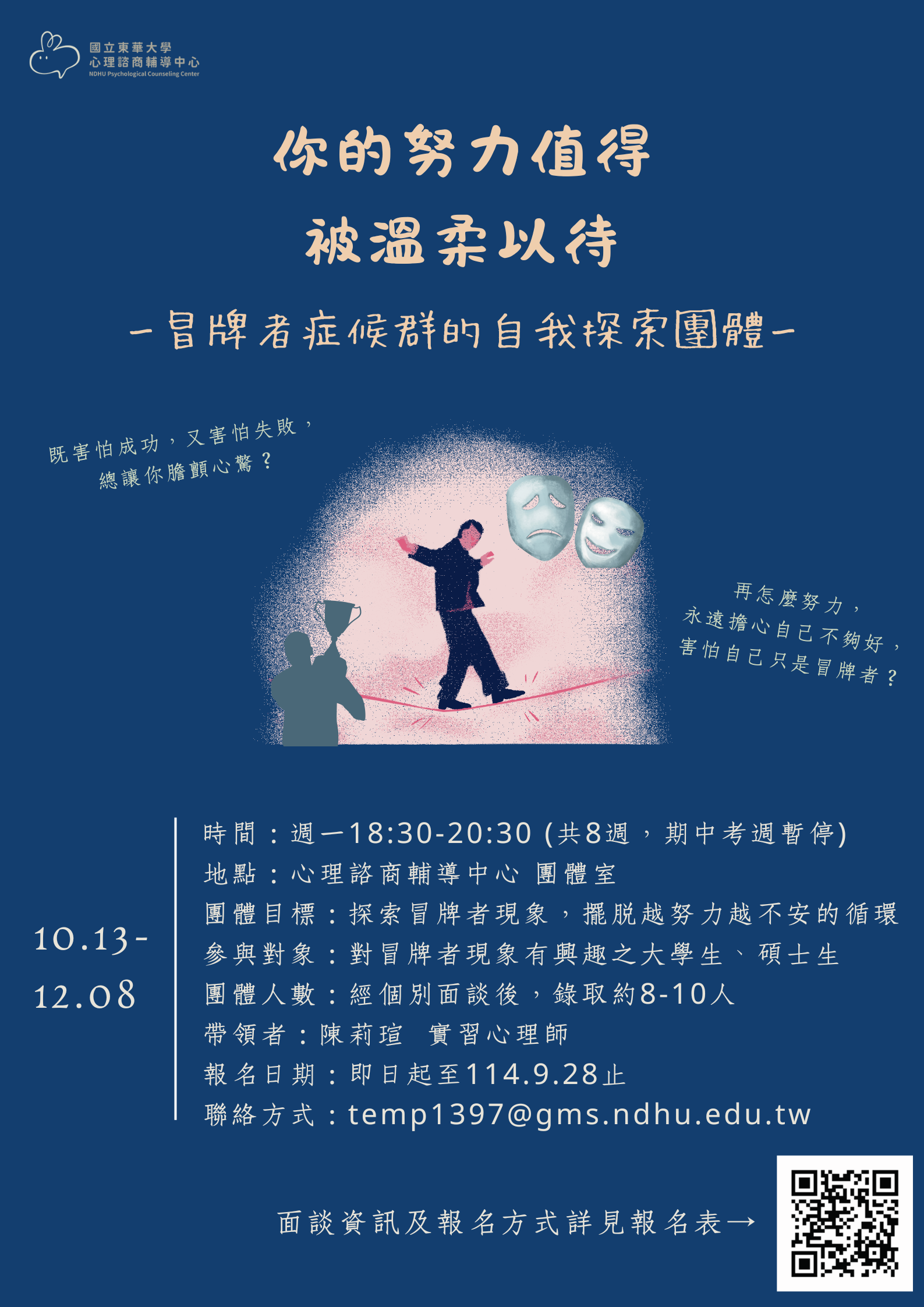 分類: 活動公告, 課程公告, 招生公告, 演講暨研討會, 其他公告 來源: 心理諮商輔導中心 - 王淳羽 - smileevelyn@gms.ndhu.edu.tw - 電話03-8906273 對象: 全校教師_全校學生_休學學生_兼任教師 標題: 《你的努力值得被溫柔以待》🌿冒牌者症候群的自我探索團體招募公告 日期: 2025-09-18  ( 星期四 )  15:55 附檔: 冒牌者團體海報.png (1 MB)