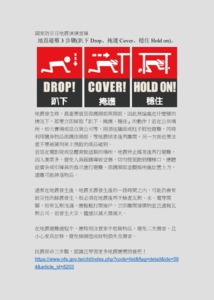 一、本校於114年國家防災日實施防災演練。請大家配合廣播實施演練。 (一)行政大樓預定於9/19日(五)09時21分實施。 (二)理工學院一、二、三館預定於9/19日(五)09時21分實施。 (三)人社學院一、二、三館預定於9/26日(五)16時10分實施。 (四)環海學院預定於9/19日(五)09時21分實施。 (五)原民學院預定於9/19日(五)09時21分實施。 (六)花師學院預定於9/19日(五)09時21分實施。 (七)藝術學院預定於9/19日(五)09時21分實施。 (八)管理學院預定於9/19日(五)09時21分實施。 (九)學生宿舍預定於10/14日(二)、15日(三)21時實施。 二、國家防災日地震避難掩護演練實施程序(廣播詞) 約於09時00分~15分播放(依各單位排定之時間實施播放) 各位老師、同學大家好,等一下9點21分的時候,本大樓要實施防震演練,到時候請大家配合演練實施。 Dear fallow students, NDHU will now carry out an evacuation drill in this building. The following instructions aim to help you escape when an earthquake occurs. Please keep these in mind! The earthquake drill will begin this morning at 09:21 A.M. 模擬地震發生時,會先按警鈴再廣播 約於09時21分播放(檔名『地震警報音響.mp3』) 約於09時21分30秒播放(檔名『112-2.mp3』) 「地震!地震!請立即就地避難掩護!」 「這個時候請大家注意頭頸部及身體保護,避免掉落物砸傷,避難時優先選擇桌子下、柱子旁或水泥牆壁邊。」 Alarm! Alarm! An Earthquake has occured! Please stay calm and hide yourself under something safe. Always find cover in a safe place when inside a building. 當地震停了時,會廣播: 約於09時22分播放(檔名『112-3-1.mp3』) 「地震停了!請所有人迅速離開大樓,依逃生路線至疏散位置集合!」 The earthquake has now stopped. Please follow the evacuation route to an open space outside the building immediately. Do not take the elevator. Instead, take the stairs and go to the designated location. 約於09時23分播放(檔名112-3-2.mp3) 1.這個時候請大家以距離自己最近的逃生通道遠離大樓,向疏散位置移動,行進間注意保護頭頸部,不要搭乘電梯,貴重物品請隨身攜帶。 2.請大家協助教室、辦公室淨空、相互提醒周遭人員疏散。 3.不要嘻笑、跑步、推擠。 4.到疏散位置後,以樓層為單位集中、並以辦公室、教室為單位集合清查人數。 5.清查完後向各樓層負責人員回報清查結果,各樓層清查人員向大樓管理員回報,大樓管理員向演練指揮官回報。 1.Try to keep calm during an earthquake. Stay away from easily falling objects and furniture such as lamps, windows, and cabinets. 2.Please do not take the elevator, take the stairs in order to avoid danger! 3.Make sure to regroup as a class after you escape and reach a safe location outside of the building. 三、地震避難掩護演練流程及應作為事項,詳如附檔。 業務承辦人:學務處生活輔導組吳昭毅校安 TEL:03-8906228 學務處生活輔導組關心您!